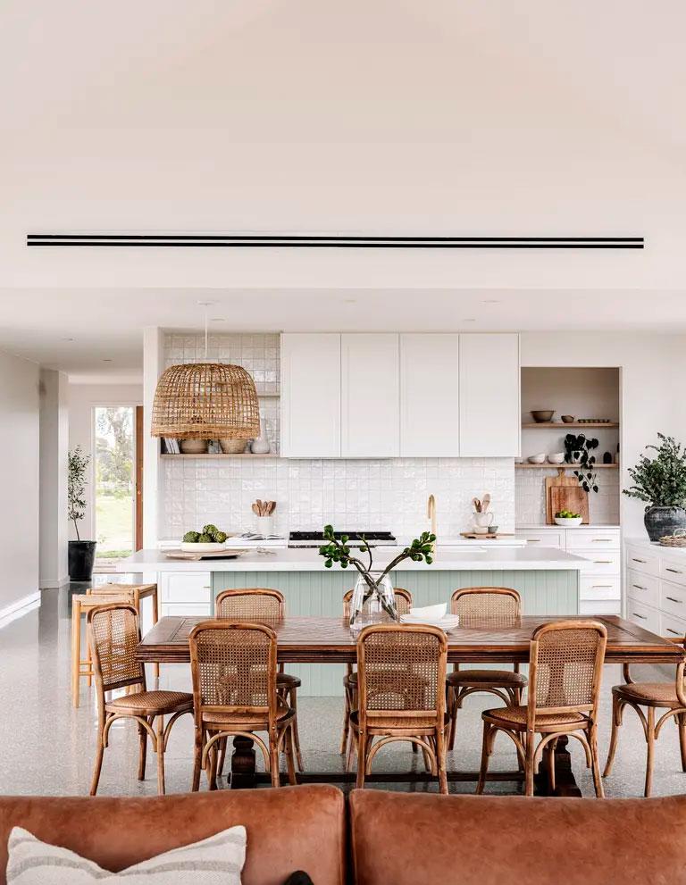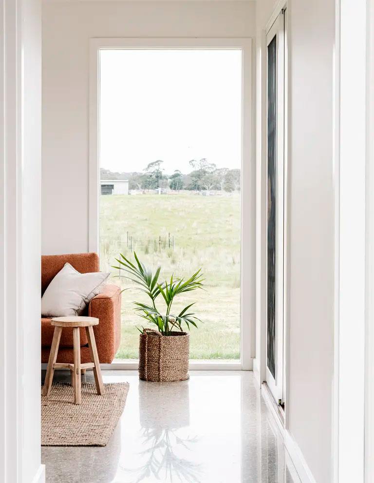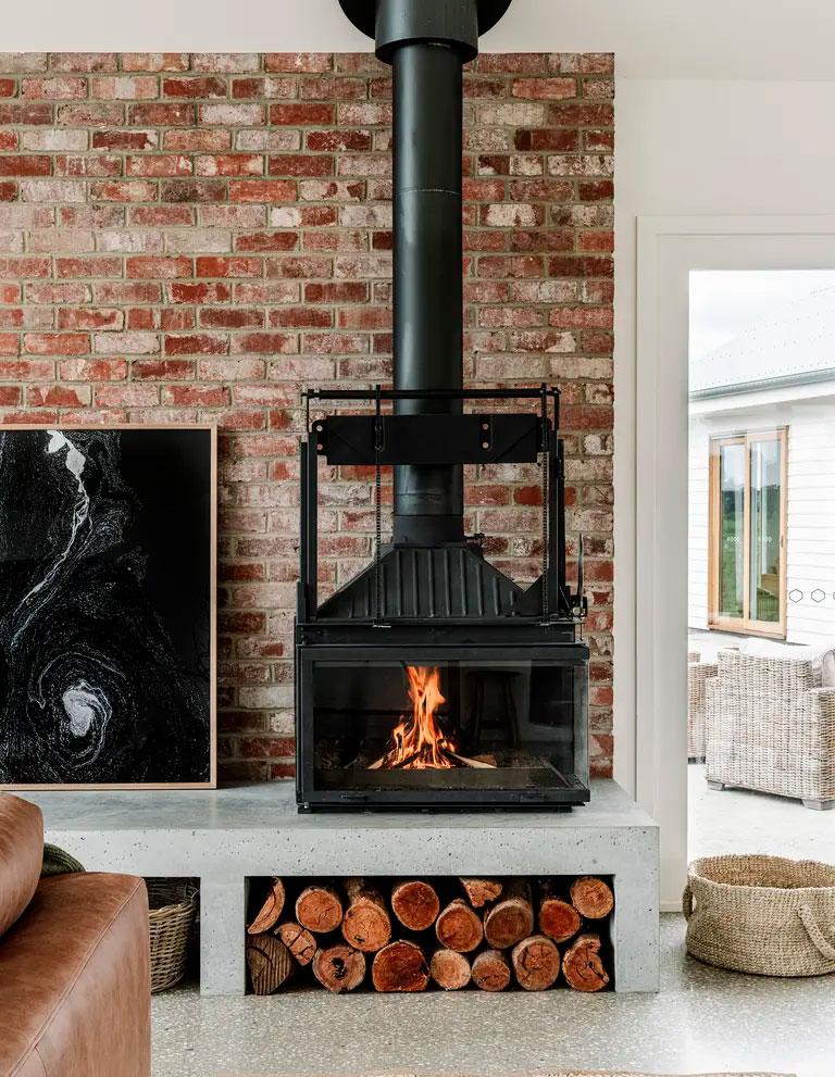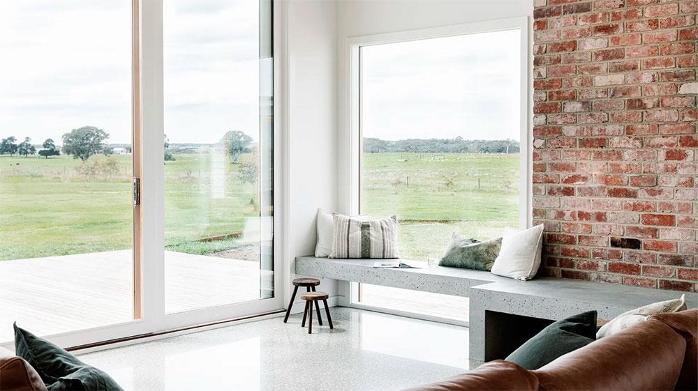 El tema de la construcción lo tenían resuelto con su propia empresa, Wade Builders, que se ocupó de dejar la casa con el mismo alma y espíritu que la antigua propiedad. Para el interiorismo contaron con Holman Designs que además, les ayudó con el diseño pasivo, reduciendo así la huella medioambiental. Cuestiones importantes como utilizar sabiamente los revestimientos o los cerramientos para sacar los máximos beneficios térmicos, fue algo que tuvieron muy en cuenta. Por ejemplo, se utilizaron suelos de cemento pulido, que son buenos conductores tanto de frío como de calor, y grandes acristalamientos para aprovechar la luz y el sol (muchos de ellos incluso, se benefician de las vistas al río). Por otro lado, también pensaron en el agua, cuyo abastecimiento proviene única y exclusivamente de los diversos tanques de lluvia distribuidos por los techos de los cobertizos.