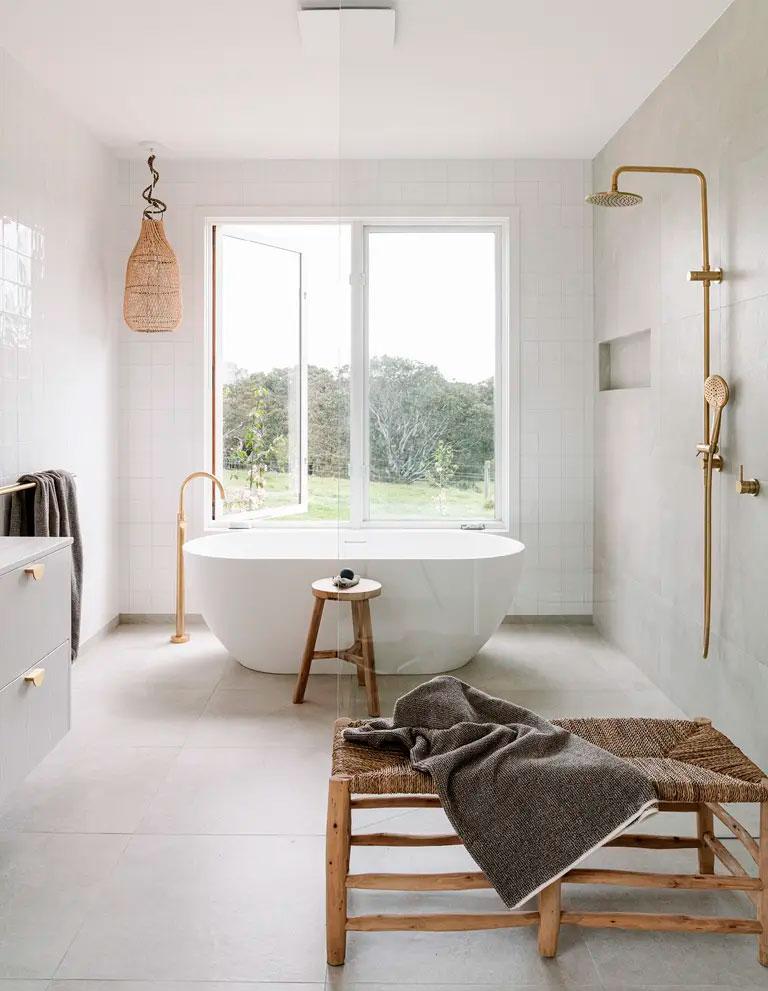 Otro imprescindible, hablando de algo más estético y funcional, era la necesidad de la propietaria de tener una cocina abierta, con despensa, zona de lavado y comunicada con la zona de estar. Se eligió una paleta de color en blanco que contrasta con elementos como las fibras naturales, el cuero del sofá, la chimenea de hierro, o las grandes puertas de granero que hacen un guiño a la procedencia de esta construcción. Sus grandes ventanales, proveen a la casa de vistas infinitas de las que disfrutan todos y cada uno de los espacios, baño incluido.