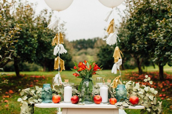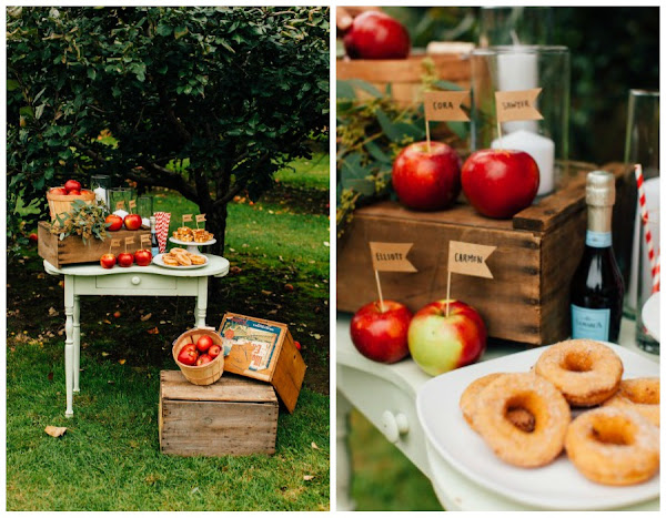 En mi búsqueda por inspiración he encontrado esta mesa decorada principalmente por manzanas y ramas, que no puede ser mas bonita.