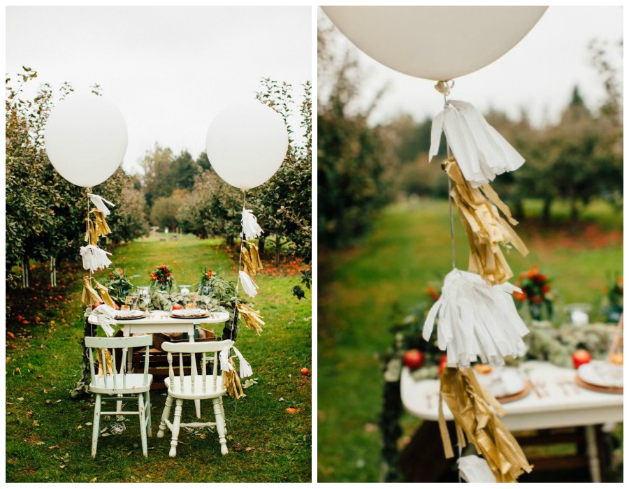 Lo cierto es que además de preciosa es una decoración de mesa lowcost. Incluso el marco lo dibuja unos globos de helio y unas guirnaldas hechas con papeles blancos y dorados.