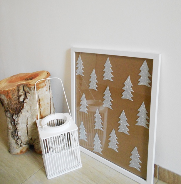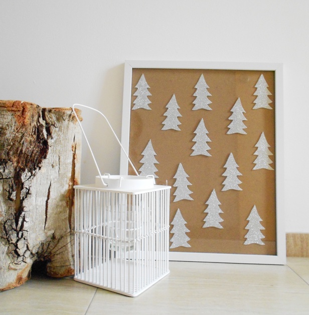 Este DIY fué inspiración total de la tela de Fine Little Day que me gusta tanto y que vimos aquí. Pensé que quedaría preciosa entelando un bastidor, de ahí se me ocurrió cortar las formas en cartulina negra y luego ya lo ví claro: pinos de purpurina plata!