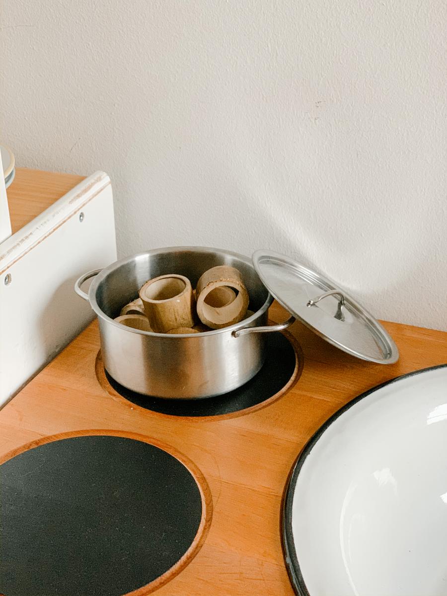 Cuando introducimos los alimentos de madera (alrededor de los 18-24 meses) causó furor, y sobre todo, cubría las necesidades motrices de manipular, trocear e introducir vocabulario en su juego. Algo súper positivo y que enriqueció muchísimo los ratos de ocio. Con el paso del tiempo y a medida que ella crecía (alrededor de los 3-3,5 años) nos dimos cuenta de que además de perder motivación por el rincón de juego simbólico, siempre seguía los mismos patrones. Siempre hacía los mismo diálogos, siempre el juego se limitaba a los alimentos que representaban las figuras y en consecuencia la creatividad del juego se había parado.