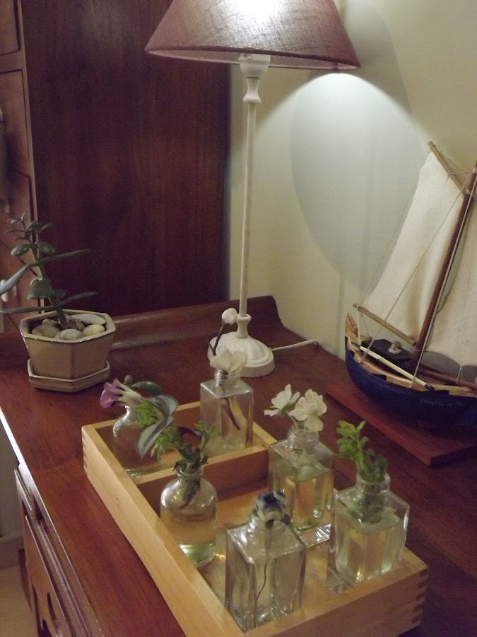 Frascos de colonia donde reproduzco plantas y crasas que luego plantó en macetas al abrigo de mi vergel...