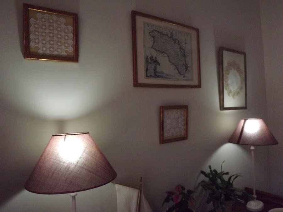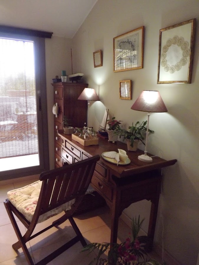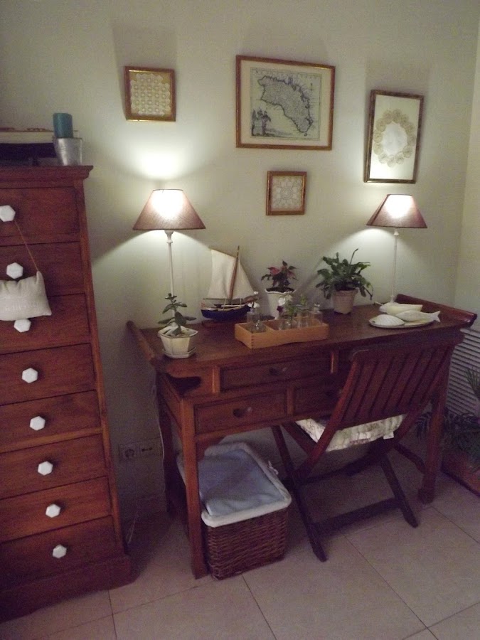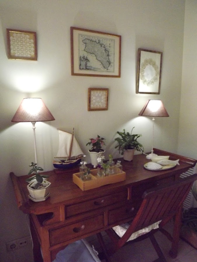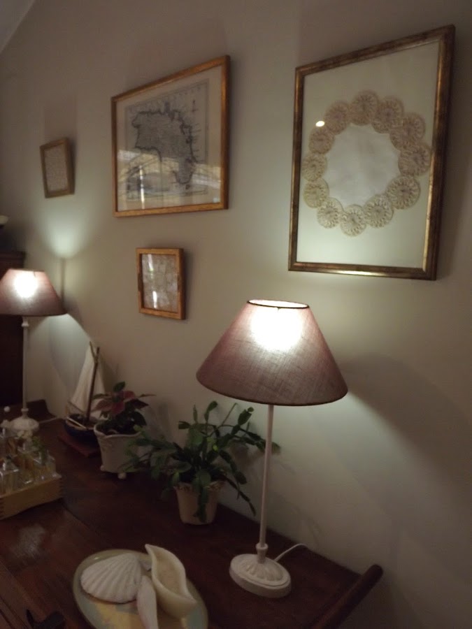 Buenos días calurosos nuevamente para todas. Hoy os vengo a enseñar mi rincón colonial con sus cuadros de pañitos colgados. Cambia la pared sin ellos y con ellos. Hay quien prefiere rincones vacíos, yo en cambio soy de las que me encanta vestirlos con todo aquello que me hace sentir y recordar lugares visitados. Por ello escogí este especial espacio en la planta de arriba para lucir mi colección de paños de hilo enmarcados. Muchas me habéis preguntado si era ésta una habitación más de mi hogar, pero no chicas, es una prolongación de la escalera que desemboca en la segunda planta. Me decían que era un espacio desaprovechado, pues no ha sido así y con un poco de ingenio he creado uno de los lugares predilectos de casa, más mío que de nadie, donde me pierdo muchas veces para hacer arreglos florales o también sentarme delante de mi ordenador. Os lo muestro a media luz, con las lámparitas encendidas porque creo que así se presenta más bonito si cabe...