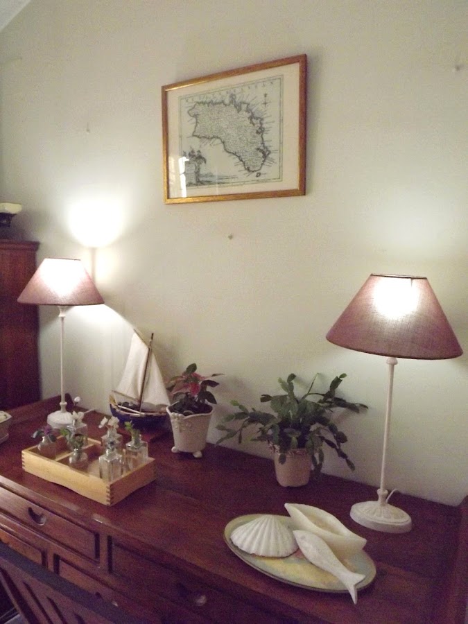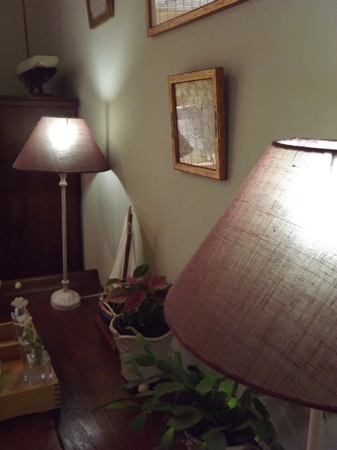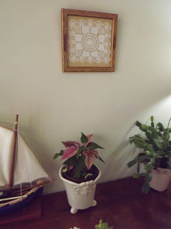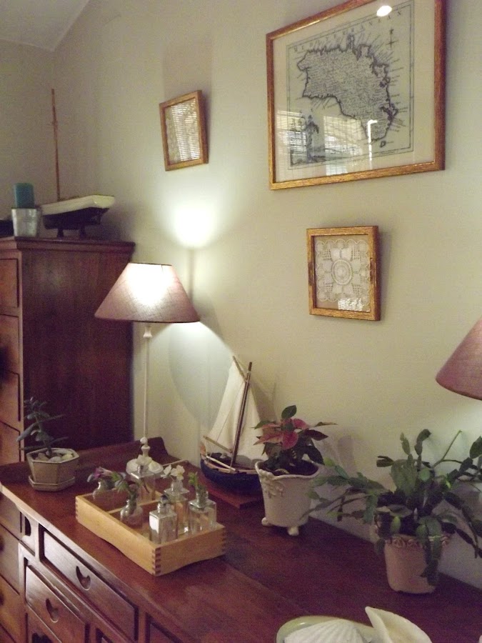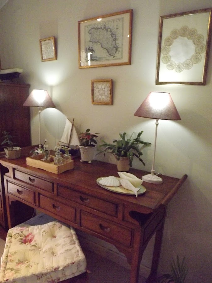 Buenos días calurosos nuevamente para todas. Hoy os vengo a enseñar mi rincón colonial con sus cuadros de pañitos colgados. Cambia la pared sin ellos y con ellos. Hay quien prefiere rincones vacíos, yo en cambio soy de las que me encanta vestirlos con todo aquello que me hace sentir y recordar lugares visitados. Por ello escogí este especial espacio en la planta de arriba para lucir mi colección de paños de hilo enmarcados. Muchas me habéis preguntado si era ésta una habitación más de mi hogar, pero no chicas, es una prolongación de la escalera que desemboca en la segunda planta. Me decían que era un espacio desaprovechado, pues no ha sido así y con un poco de ingenio he creado uno de los lugares predilectos de casa, más mío que de nadie, donde me pierdo muchas veces para hacer arreglos florales o también sentarme delante de mi ordenador. Os lo muestro a media luz, con las lámparitas encendidas porque creo que así se presenta más bonito si cabe...