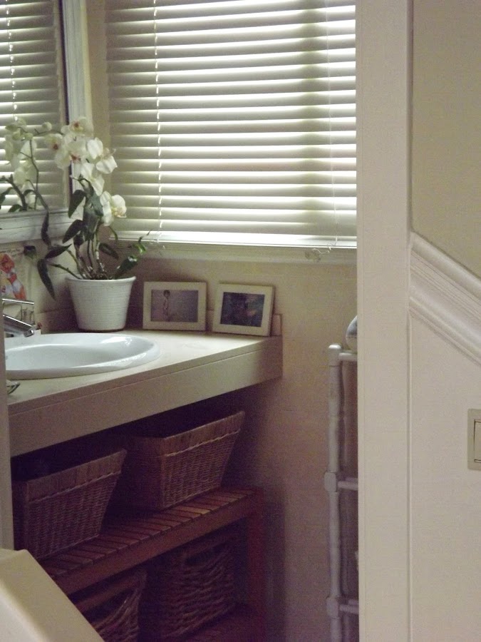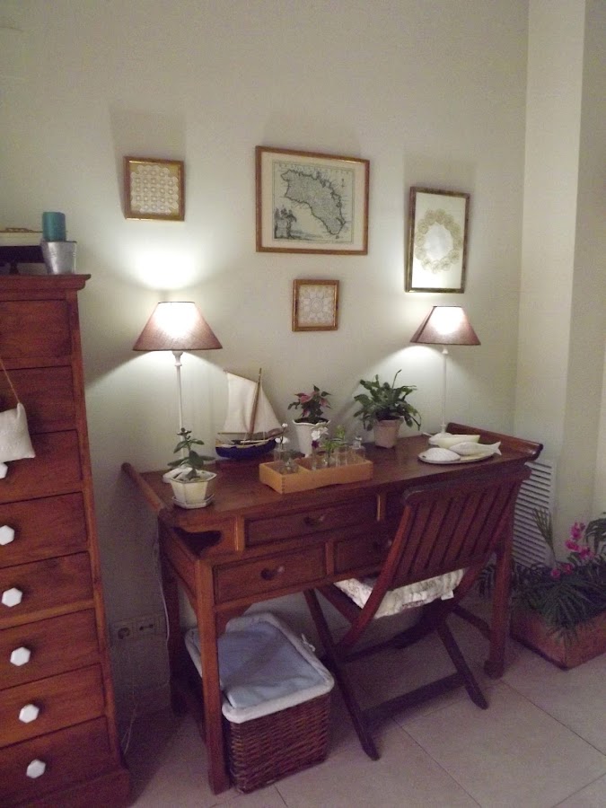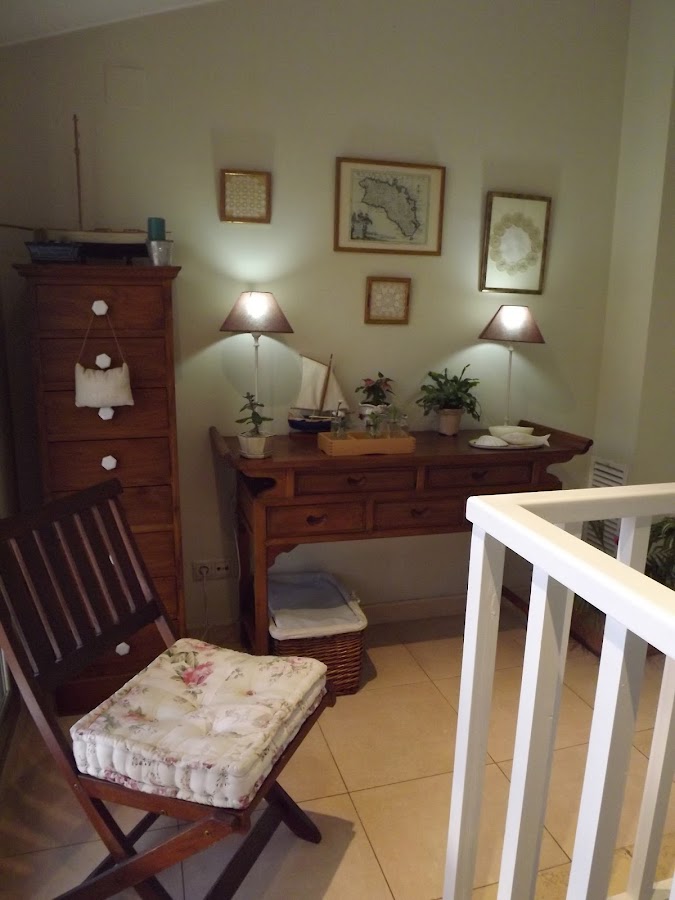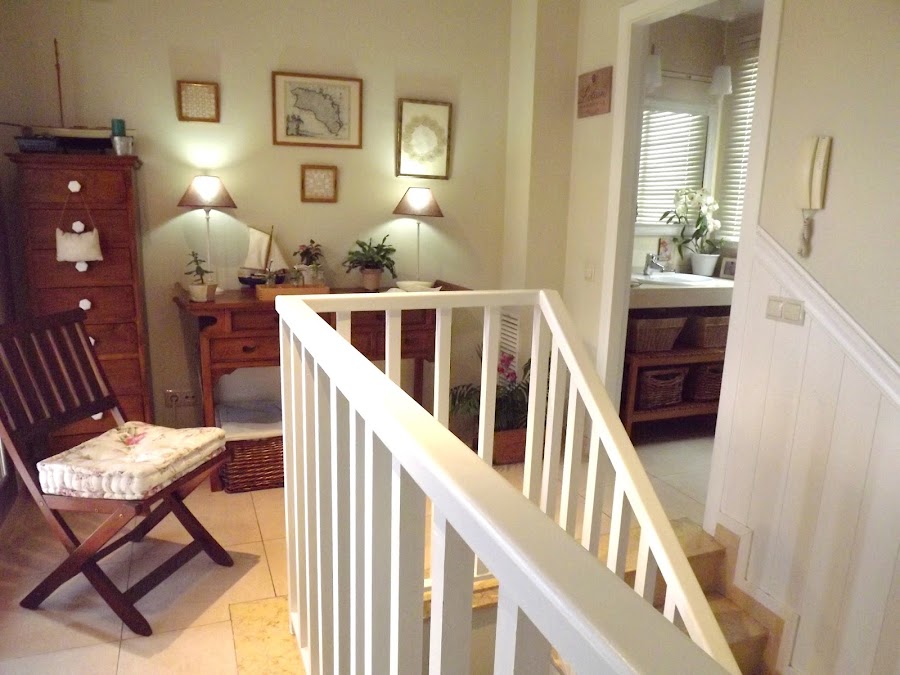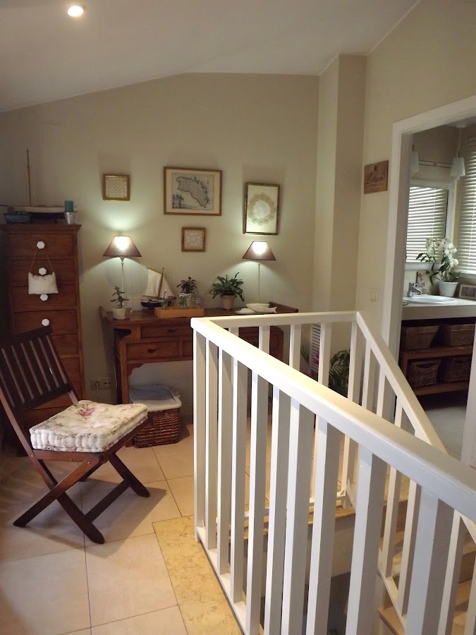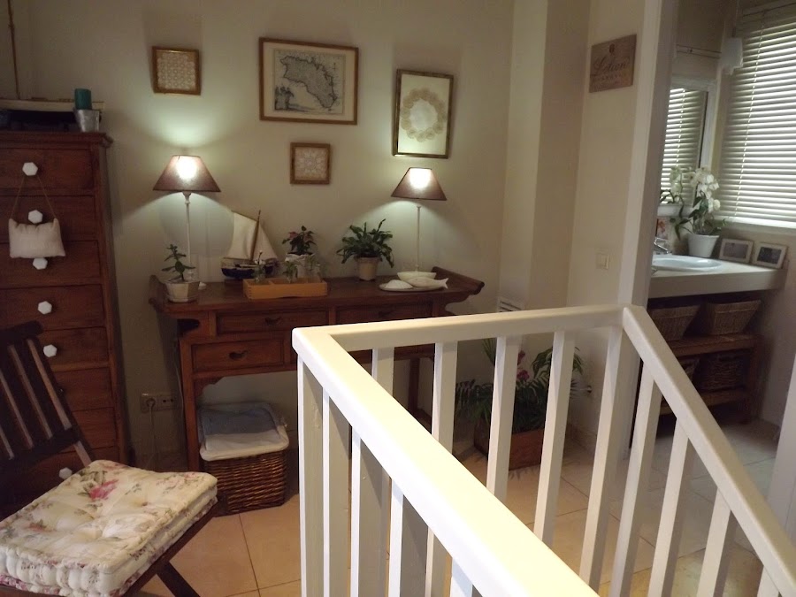 En él se agrupan muebles antiguos de madera de teca en contraposición con el blanco que reina en la primera planta. Iban a ser provisionales pero cada día me gusta más el efecto que causan, así que permanecerán por mucho tiempo más...