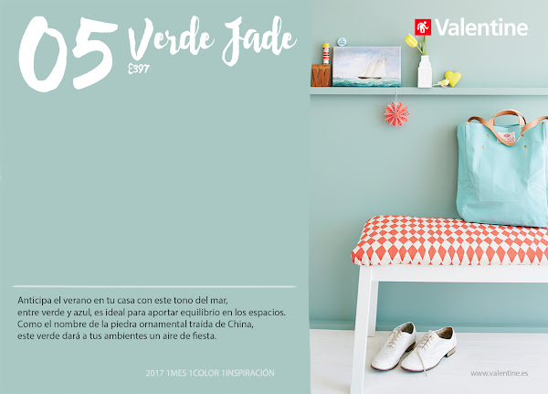 El color de Mayo es verde Jade según Barnices Valentine. Es un color que nos recuerda al mediterráneo, al color del mar ese tono entre verde azul, azul verde, ideal para aportar equilibrio a los espacios. Nos adelantamos al verano con este color que ilumina y añade ligereza a la zona en la que se aplique.