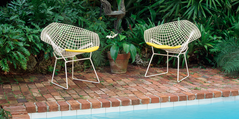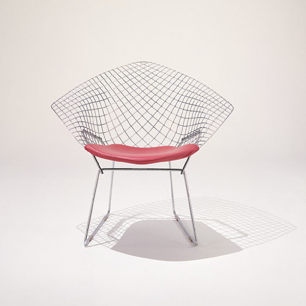 La silla fue diseñada a principios de los años 50 por Harry Bertoia, con una estructura de barras entrecruzadas que le otorga un aspecto de ligereza ideal para espacios pequeños que requieren piezas ligeras.