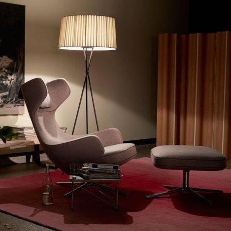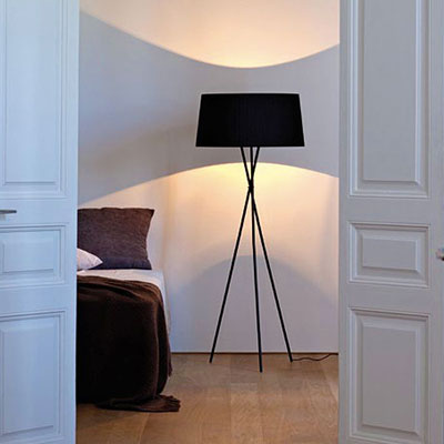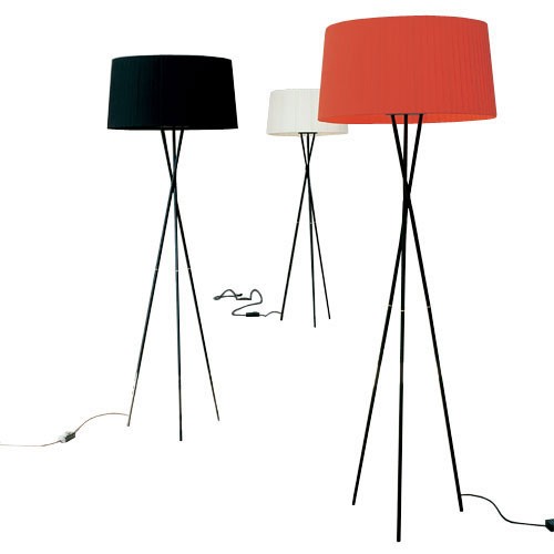 Esta conocida lámpara de pie fue diseñada en el año 1997 por la firma Santa&Cole, su nombre TRÍPODE procede del pie con tres finas patas realizadas en acero negro. La pantalla textil de gran tamaño destaca así sobre las finas patas, pantalla que podemos encontrar en tres colores diferentes negro, crudo y rojo/ámbar.