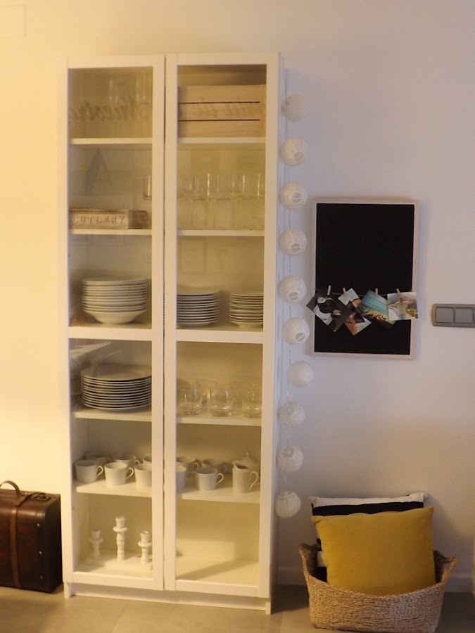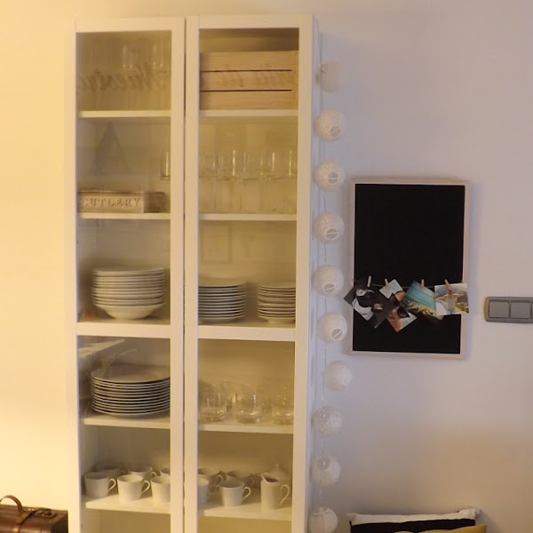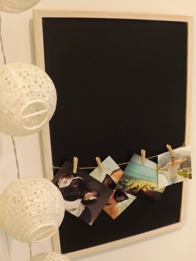 Así que estuve pensando y finalmente dije... ¡YA ESTÁ, UNA PIZARRA CON FOTOS Y TEXTO! me hice con mi pizarra, pinte el marco de blanco (solo una capa para que se apreciaran las vetas de la madera) y le añadí una cuerda con pinzas para fotos.