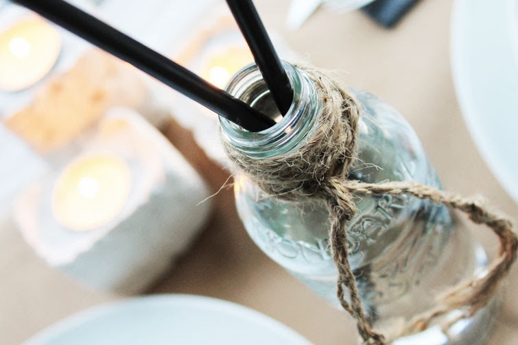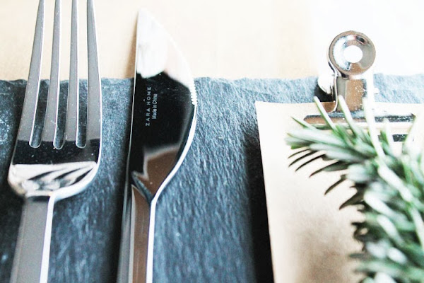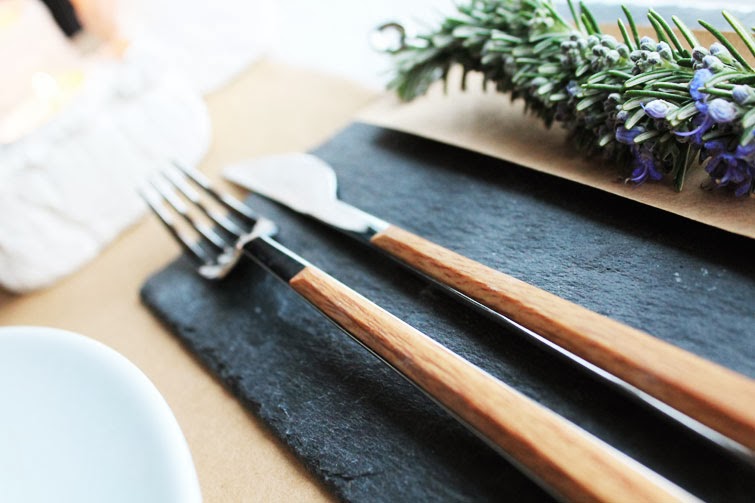 En la opción 2, sencillamente descolgamos los portavelas y los utilizamos en una idea de mesa, con papel kraft, cubiertos de líneas rectas, menaje sencillo (el blanco le queda perfecto a la mesa), unas pizarras como toque especial donde dispusimos los menús, acompañados de una ramita que aporta la nota de color al conjunto. Os lo enseñamos todo pero ya!