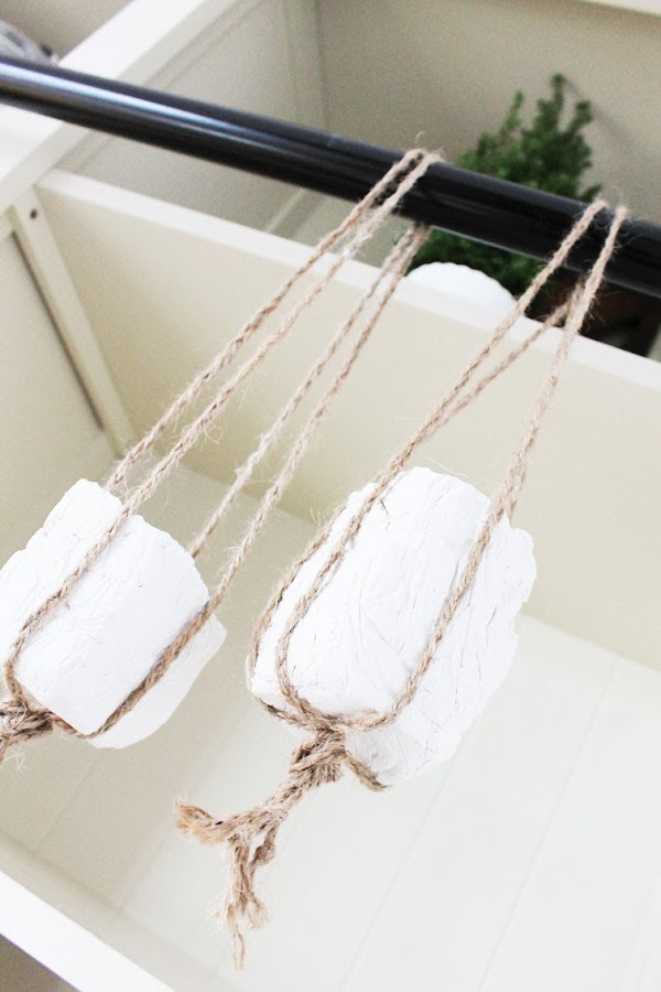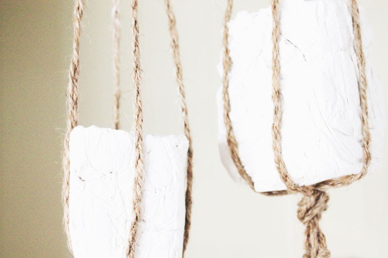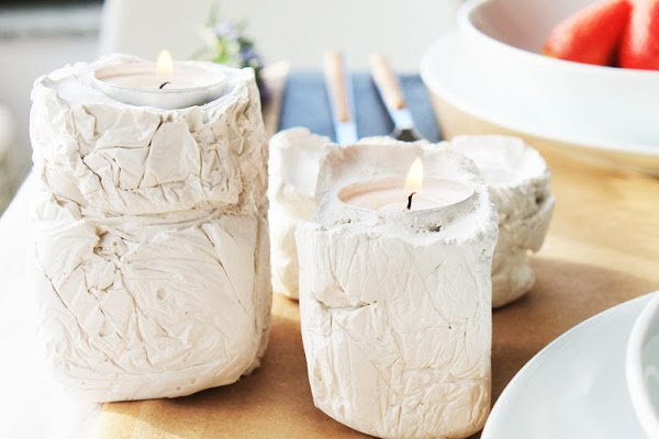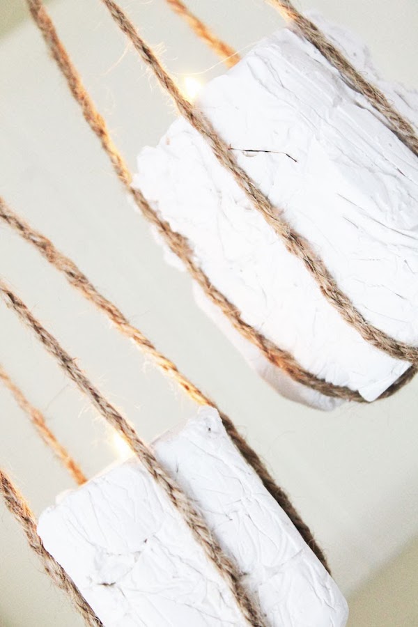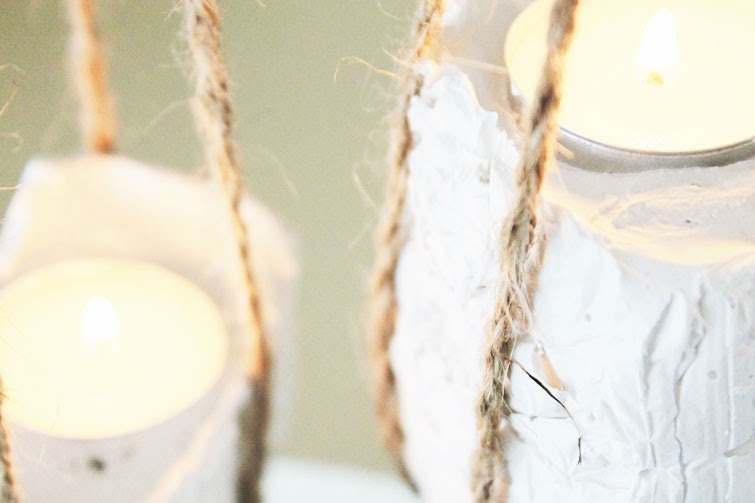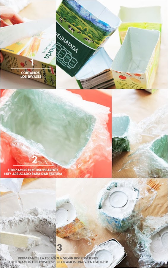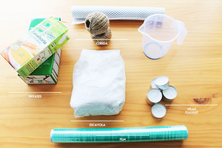 La verdad es que los materiales para este DIY (envases reciclados, cordón de embutido o similar y algún elemento sorpresa que cada una usase!) eran perfectos par una idea que teníamos en mente desde hacía tiempo: unos tealight que pudiesen estar suspendidos y en otras otras ocasiones, que funcionasen como parte de un centro de mesa, o como DECO complementaria en un rincón, o regalitos en un boda (en fin... más cosas!). Nuestro material sorpresa es la escayola a la que dimos forma con los moldes de cartones. Luego trenzamos el cordón de embutido y así, nos quedaron unas cadenetas (el color y el aspecto "rústico" que le dan a los portavelas nos encanta!) de las que colgar los tealight.