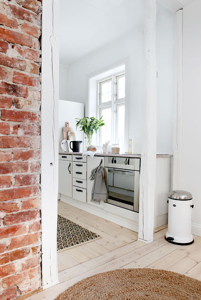 Desde su pared de ladrillo hasta su jardín con una bonita valla de madera blanca, esta casa es sencilla, ligera, usa los elementos justos, no sobrecarga y puede ir actualizándose con pequeños toques de textiles sutiles durante todo el año, un ejemplo para los amantes del nórdico mas básico y minimal, yo me quedo con la subida de la escalera llena de faroles, no importa el tiempo que pase es un elemento decorativo atemporal y que siempre queda bien.