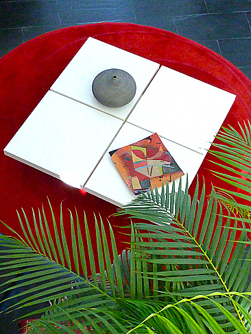 Pues bien, la construcción es la siguiente: la base está hecha con tres de las mesas, uniéndolas entre sí, una encima de otra, para formar una especie de cubo, sobre el que irá anclado el sobre de la mesa. Este está fabricado con otras cuatro mesas LACK, formando un damero, con una pequeña separación entre cada parte, para darle más ligereza al conjunto y un aspecto mas moderno.