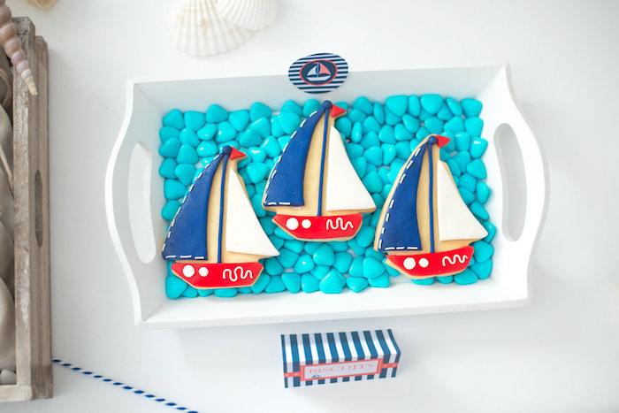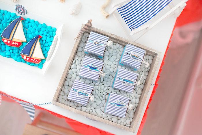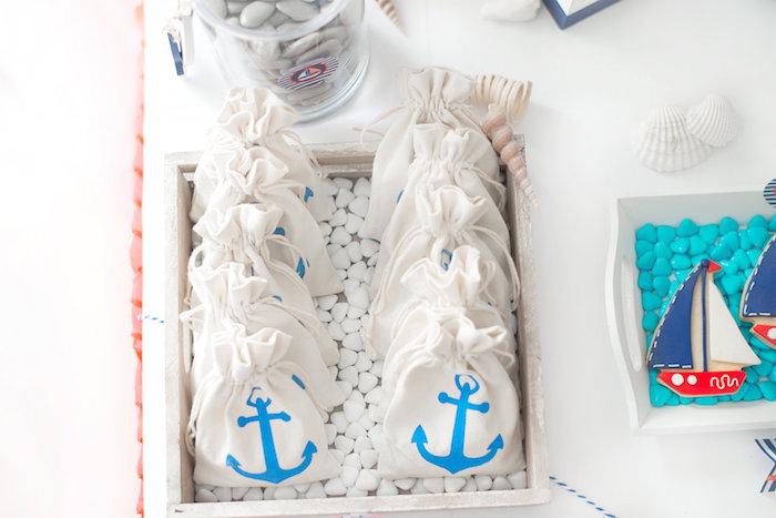 Regalos invitados: Las bolsitas del ancla son más que bonitas para utilizarlas como envoltorio. Se puede regalar una pulsera de cordón, un llavero de ancla o un colgante con un barquito. También quedaría genial si son niños más pequeños regalar un barquito de madera, un puzzle de barco o una camiseta de patchwork con un barquito y el nombre de cada niño