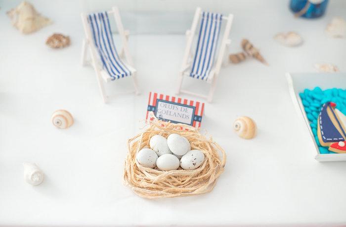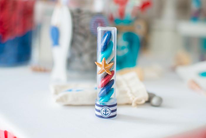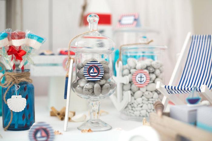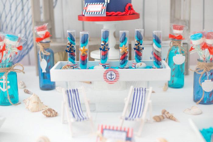 La tarta me parece muy original, sobre todo como han conseguido imitar los nudos marineros y las olas, las bolsitas de regalo para los invitados son ideales, los adornos de los cupcakes son súper originales y los tubitos de chocolate de colores simulando piedras con los adornos náuticos quedan preciosos. También quedan súper graciosas las hamacas de playa!