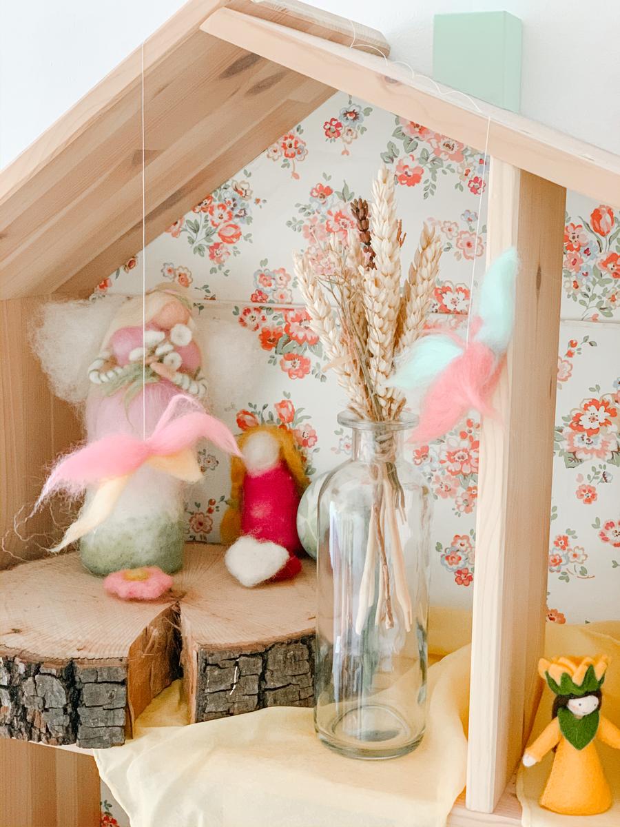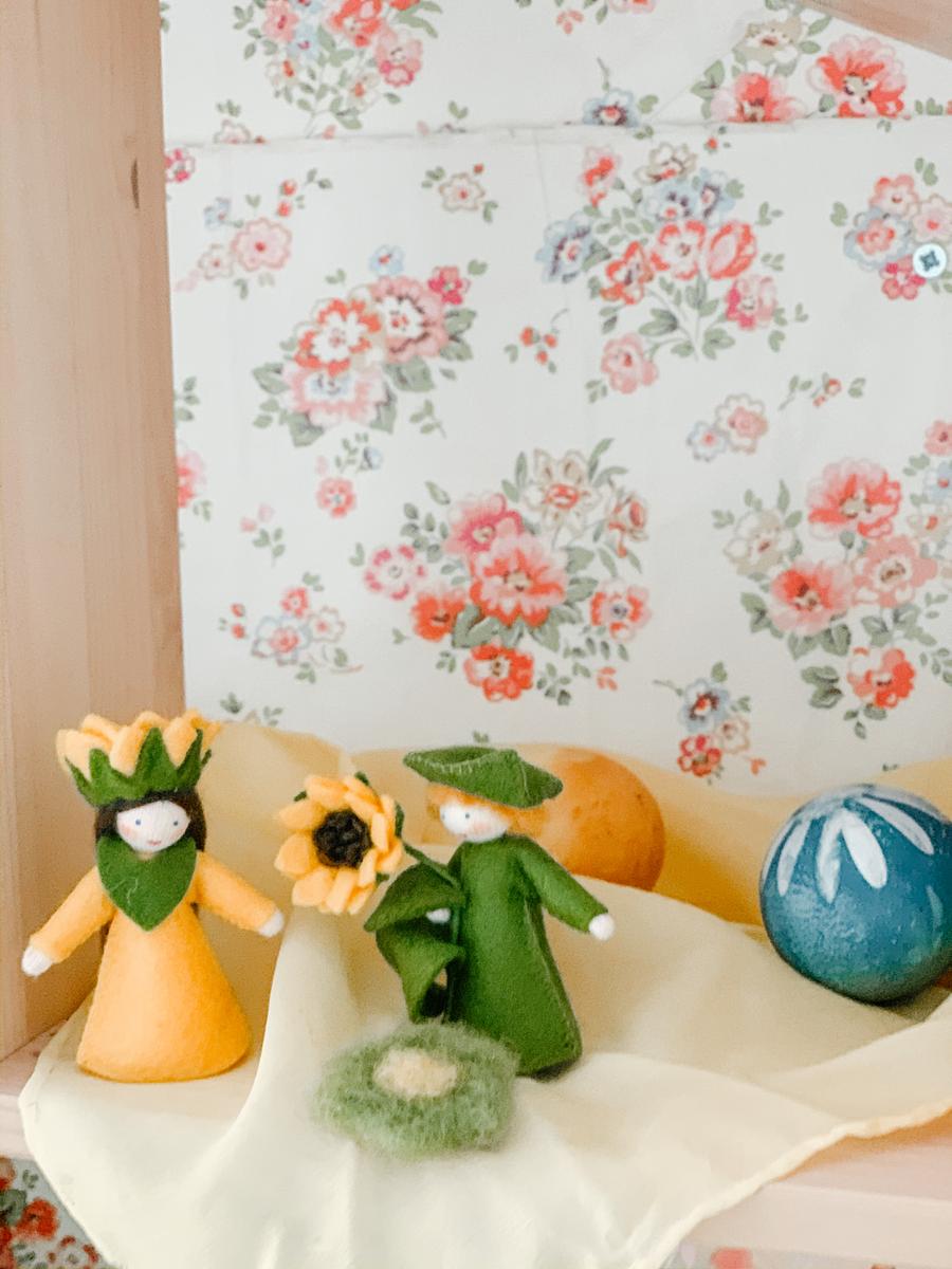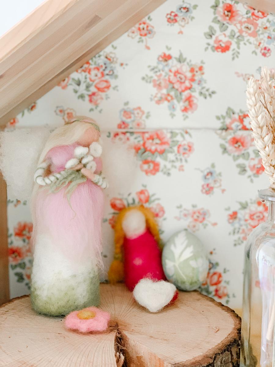 Primero de todo, pusimos nuestros pañuelos de seda con los colores de la estación y las bases de madera. Como elemento principal la reina Primavera (una hada hecha de lana cardada que compramos en LoraLora. En esta tienda tenéis todo lo necesario para crear una mesa de estación). Valentina siempre coloca esa figura de niña que la representa a ella, y que fue el primer regalo que hicieron en su escoleta cuando cumplió 2 añitos