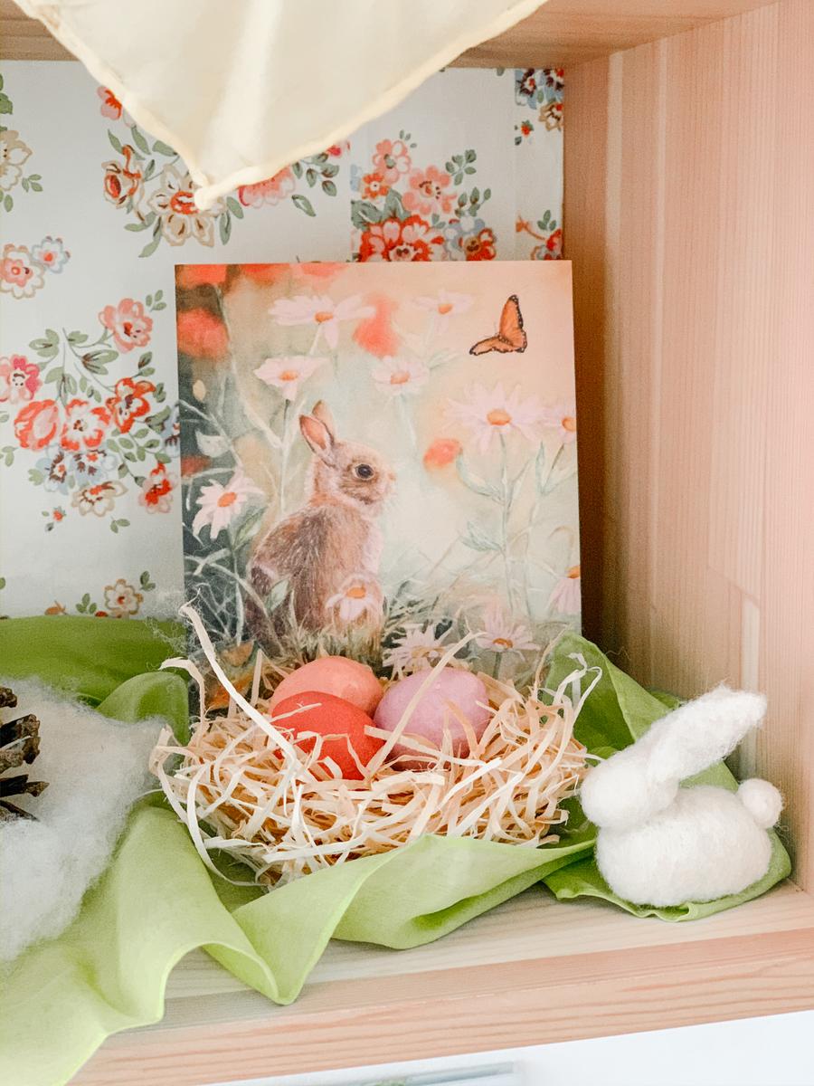 En el kit para preparar tu mesa de primavera de Lora Lora también vienen otros elementos como una postal con paisaje de la estación, un nido con huevos de pascua, una pequeña liebrecita, 2 mariposas preciosas o un florero de cristal para poner flores. De momento nos tendremos que conformar con flores secas, aunque la idea era que siempre hubieran frescas. ¡Pero no pasa nada!