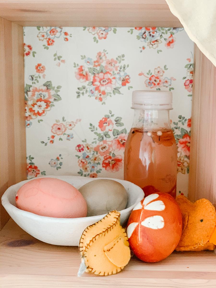 También añadimos los huevos que hemos tintado estos días, los pollitos que hice con fieltro (y que pronto os subiré el tutorial) y nuestra botella sensorial de primavera (podéis ver cómo hacerla aquí).