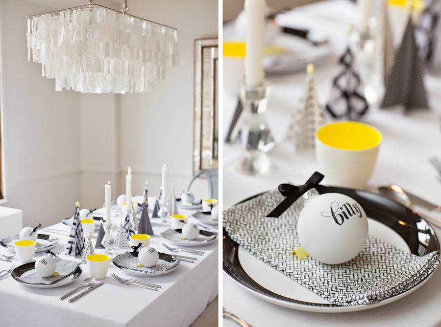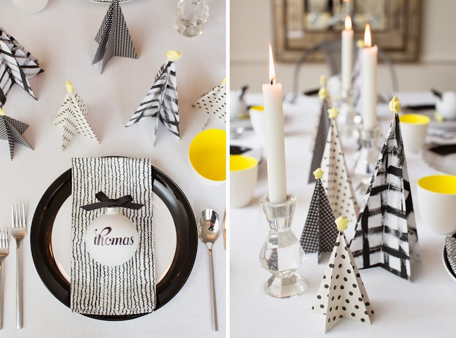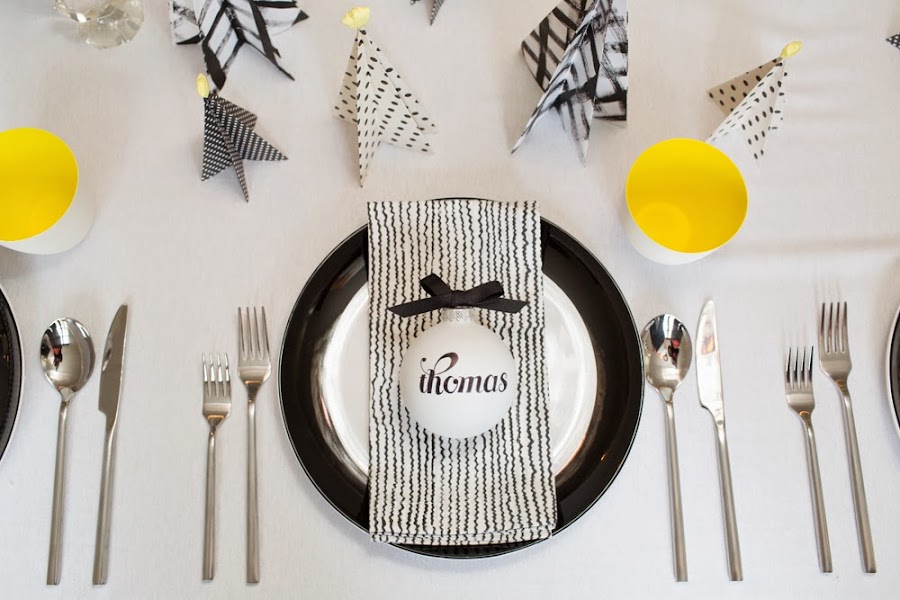 Aquí estoy con mi segunda mesa de hoy decorada para la Navidad de una forma, sencilla,rápida y económica. Si la primera mesa era luminosa, en esta ocasión apostamos por un estilo moderno y desenfadado, en el que los colores elegidos, como no podían ser de otra forma, son el negro y blanco, pero con una nota de color en alegre amarillo intenso.