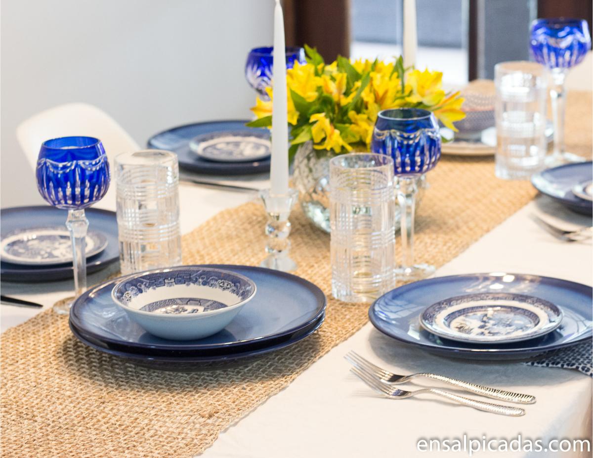 Si te fijas, las copas, que son de cristal con azul cobalto (también de la casa de mis padres) añaden un toque formal a lo que es verdaderamente una mesa servida para una ocasión no formal.