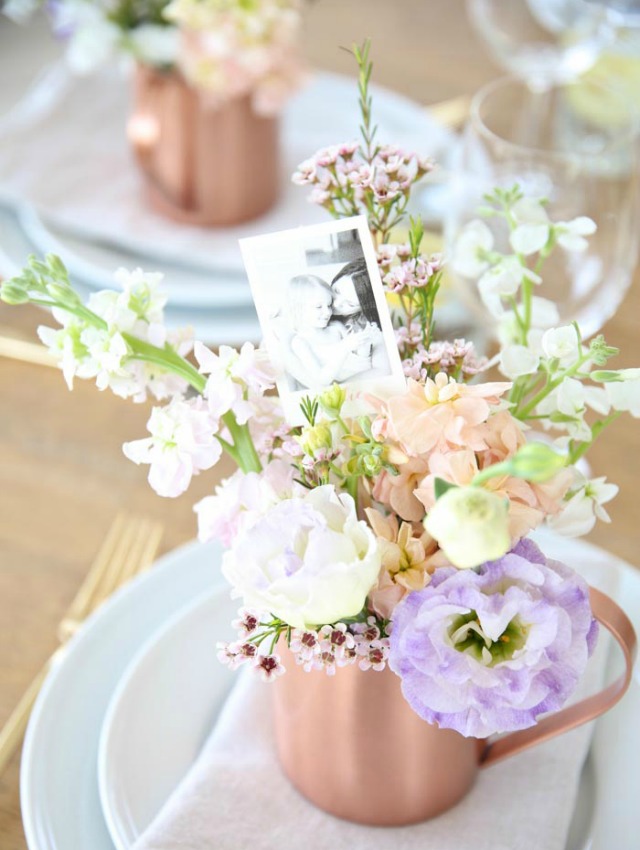 Empezamos eligiendo unas tacitas de metal cobrizo que utilizaremos como pequeños floreros. Colocaremos en su interior flores y pequeñas ramas silvestres con los que crearemos unas delicadas composiciones. Como toque final unas fotos de nuestra infancia con mamá formando parte del arreglo floral.