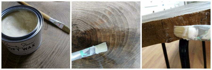 Una vez ya tenemos nuestras patas colocadas, ya sólo nos queda darle un par de manos de cera incolora para proteger la madera. Eso sí sin olvidar los laterales de la rodaja.Seguimos los mismo pasos que realizamos en el espejo renovado y en las sillas de comedor.