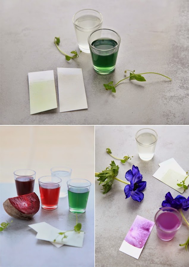 En realidad, lo que vemos en las imágenes son servilletas (las tarjetas las utilizó para otra idea), pero ella mismo nos cuenta que utilizó el mismo proceso para teñirlas, sumergiéndolas varias veces en el agua de cocción de diversos alimentos (todos con mucho colorín, claro!). Os gusta para mesa de verano (esas fresas... Ñam-ñam!).