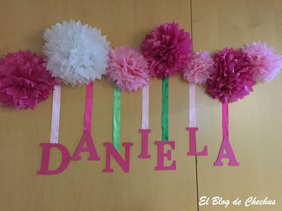 Los tonos, en rosa y verde y quería su nombre, así que se me ocurrió colocar las letras como si colgaran de los pompones.