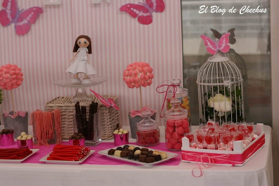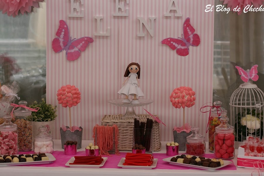 Menudo reto tenia con esta mesa, Elena es prima de Raquel, la de la mesa de la entrada anterior, y tomaban la comunión una al día siguiente de la otra, y yo quería que las mesas fueran totalmente diferentes,¡¡¡una locura!! pero yo encantada..jaja. Además de eso, el domingo mientras montaba, caía una lluvia tremenda, y era en terraza, que aunque estaba cubierta... yo sufría por mi mesa...