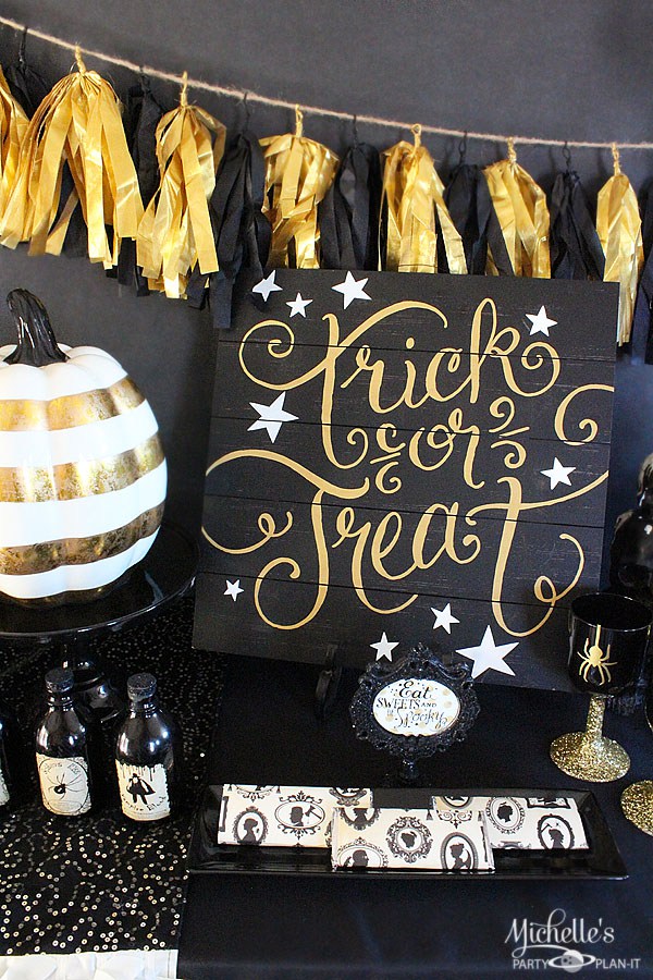 Con un poco de pintura negra, creamos el cartel de madera con la famosisima frase "truco o trato", decoramos unas calabazas o pintamos unas ramas secas (para esto mejor si la pintura es en spray).
