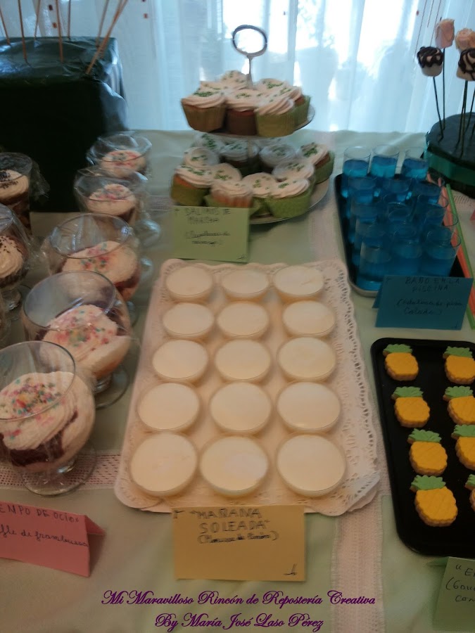 Con el título de "Mañana soleada", estas mini mousses de limón. Al fondo a la derecha con el título "baño en la piscina" unos chupitos de gelatina azul con sabor a piña colada.