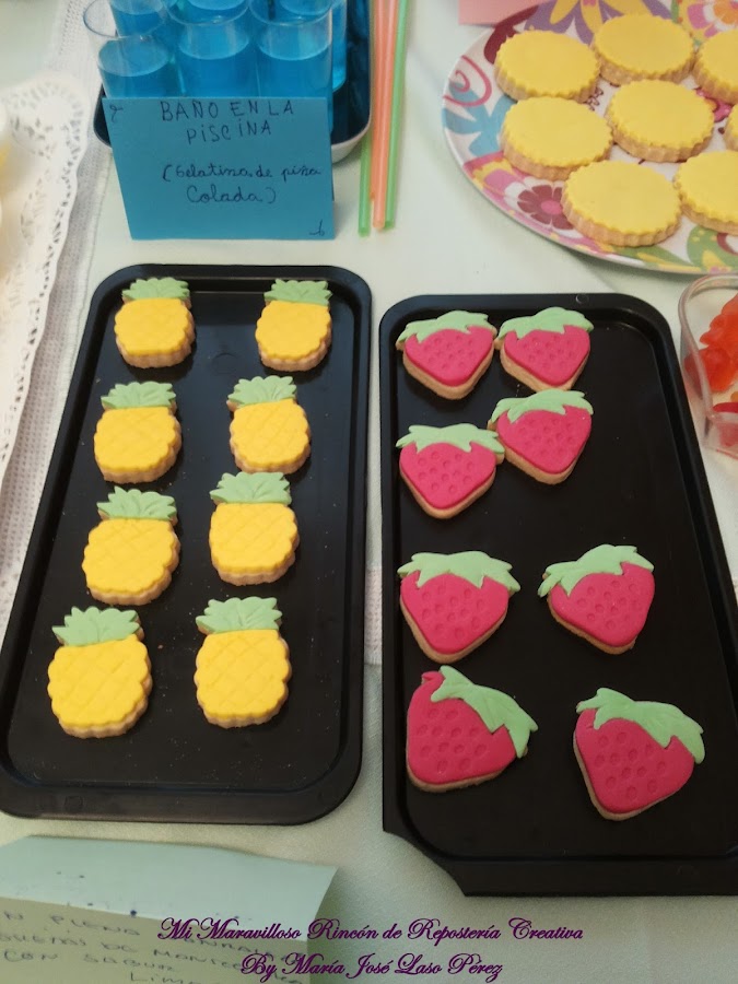 Bajo estas fotos unas "refrescantes frutas" de verano y unos "soles" de galletas de mantequilla decoradas con fondant.