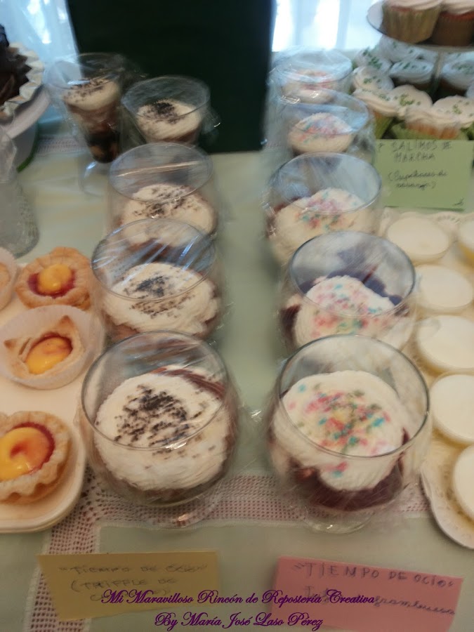 En esta fotografía diez copas de cristal con el cartel "Tiempo de ocio". Son cinco triffles de bizcocho de vainilla, crema de chocolate y nata. Y otros cinco de bizcocho de vainilla, sirope de fresa y nata.