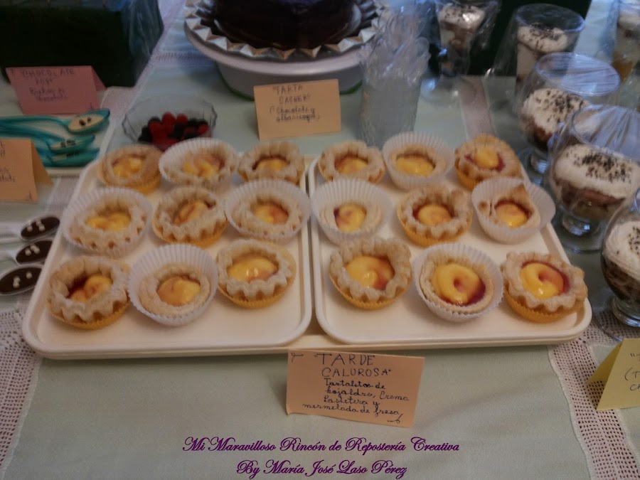 Tras el cartel "Tarde calurosa", tenemos unas exquisitas tartaletas caseras de hojaldre, rellenas de crema pastelera, con coulís de frambuesa. ¡Riquísimas!