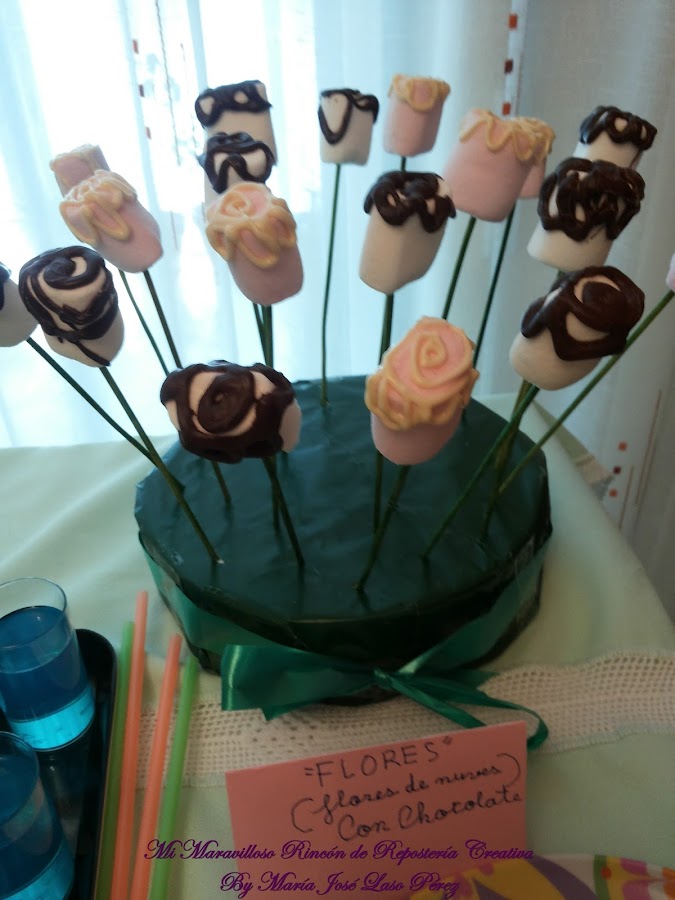 Deliciosas brochetas de malvaviscos bañadas en chocolate, imitando "flores"