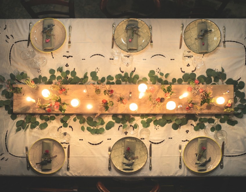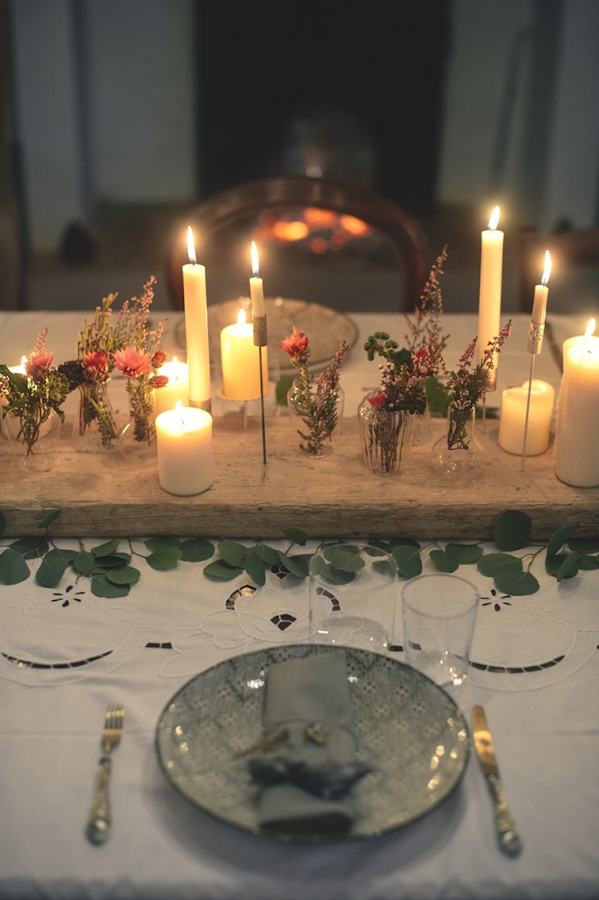 jarrones delicados (ese contraste tablero rústico + cristal delicado nunca sale mal), mantel bordado con aire muy bohemio, velas en diferentes alturas y... Maravillosa!
