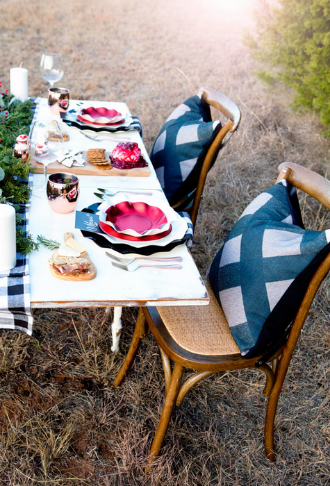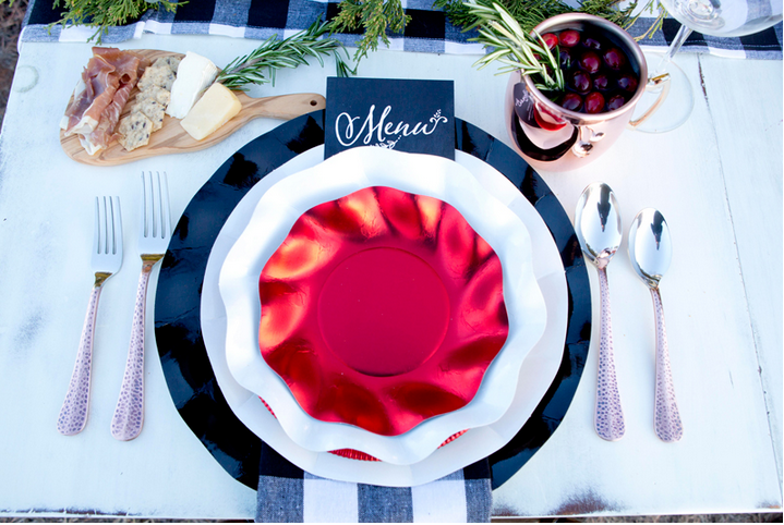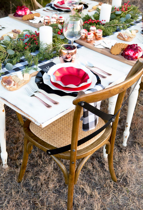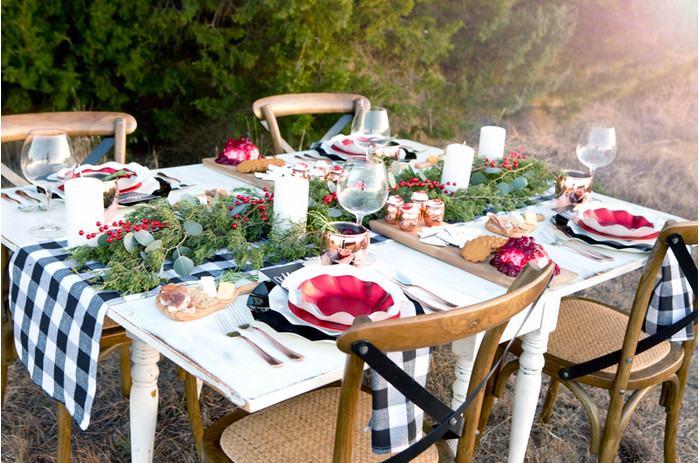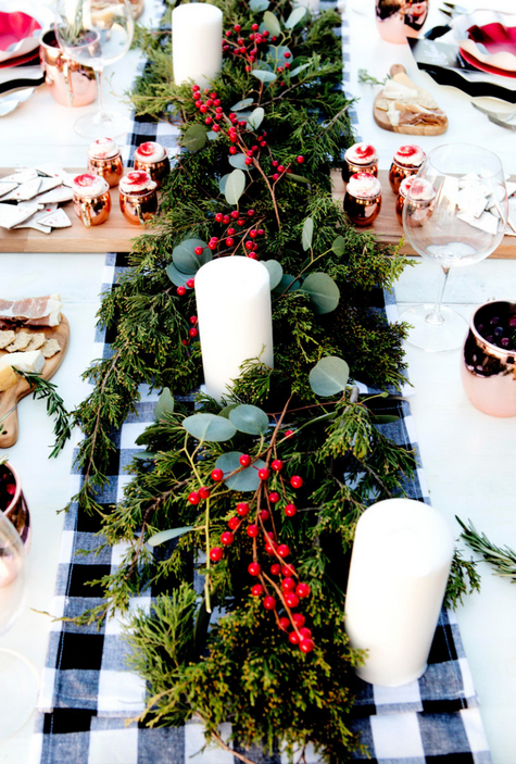 Como sabeís, lo campestre está de super moda y en este blog han tomado buena nota y nos muestran una preciosa mesa navideña en blanco, negro y rojo, donde no puede faltar un gran camino de mesa y servilletas a cuadros blanco y negro y un larguisimo centro de mesa a base de hojas verdes y bayas rojas.