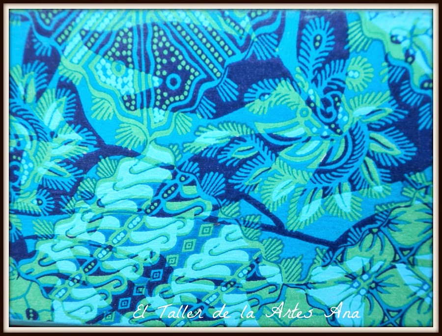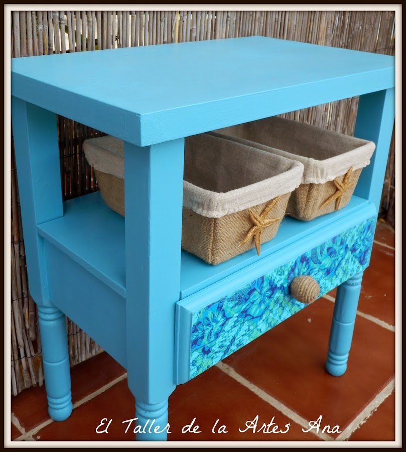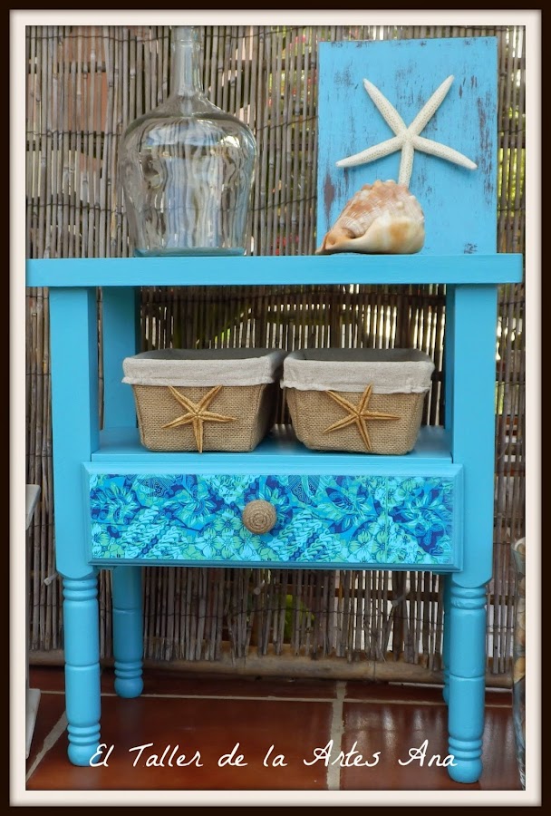 El frente del cajón lo he empapelado con una preciosa servilleta en todos azules y verdes que combina perfectamente con el azul del esmalte.