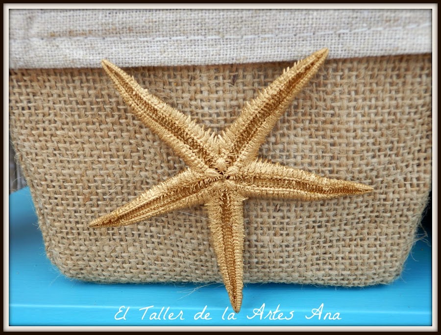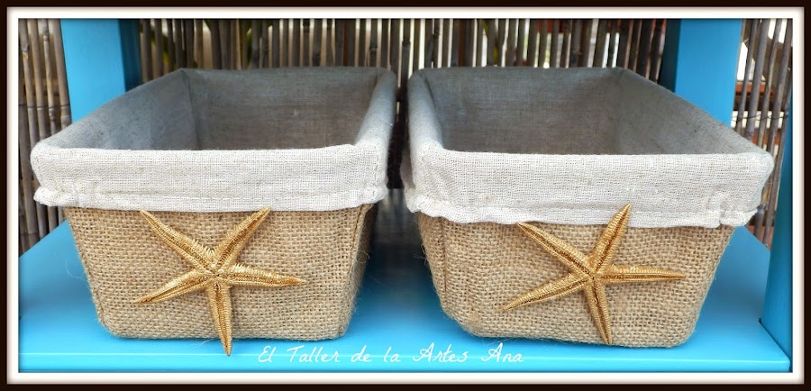 En el hueco que tiene la mesita he puesto dos cestitos forrados de arpillera y lino y a las que he pegado unas estrellas de mar que previamente había pintado con spray dorado.