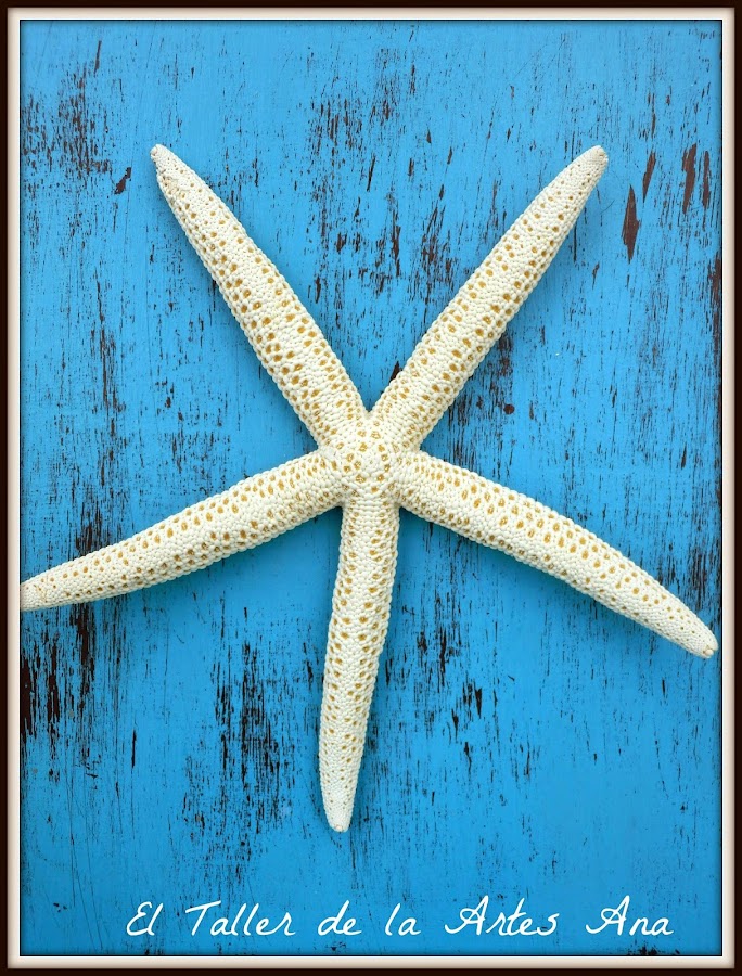 Hice un cuadrito con una tabla de DM pintada en el mismo color y decapada. Le pegué una estrella de mar comprada en una de mis pocas escapadas playeras y voilá ya tenemos un complemento totalmente coastal!!