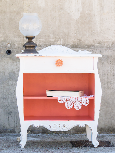 La mesa originalmente llevaba puertas. Como a veces a inspiración llega cuando menos de lo esperas, a mí me paso eso, ya que mientras restauraba y pintaba el interior con este precioso color coral, me di cuenta que me iba a dar pena taparlo colocando de nuevo las puertas.
