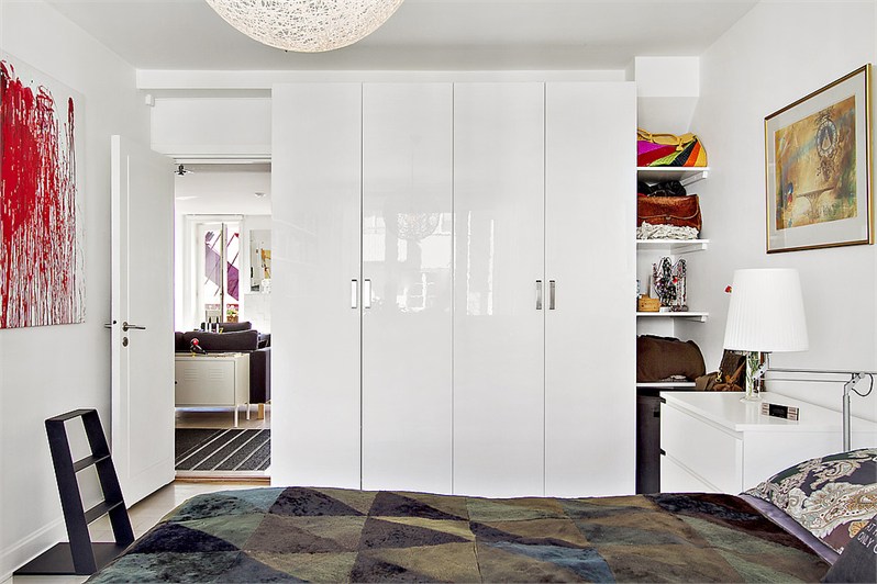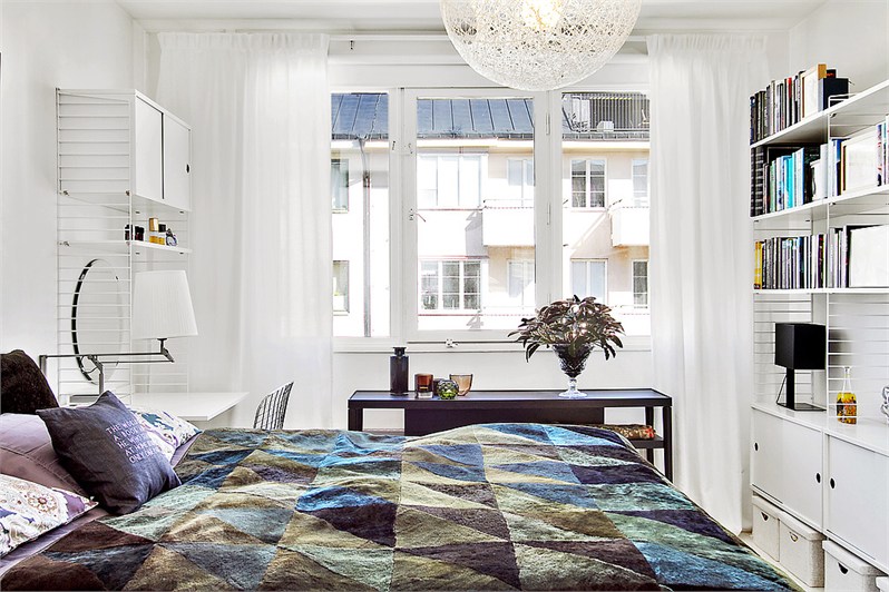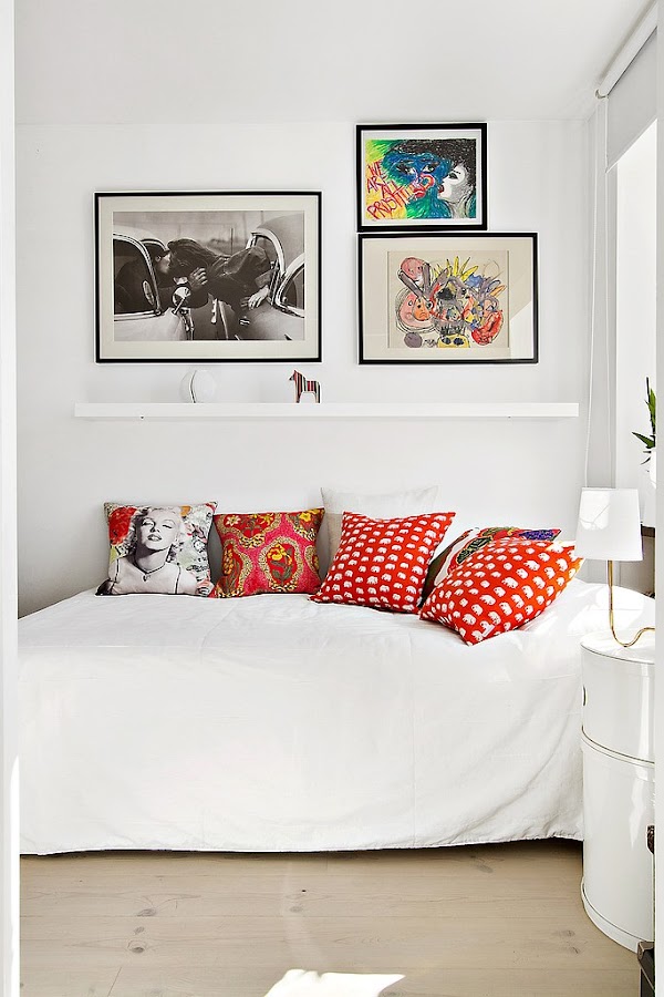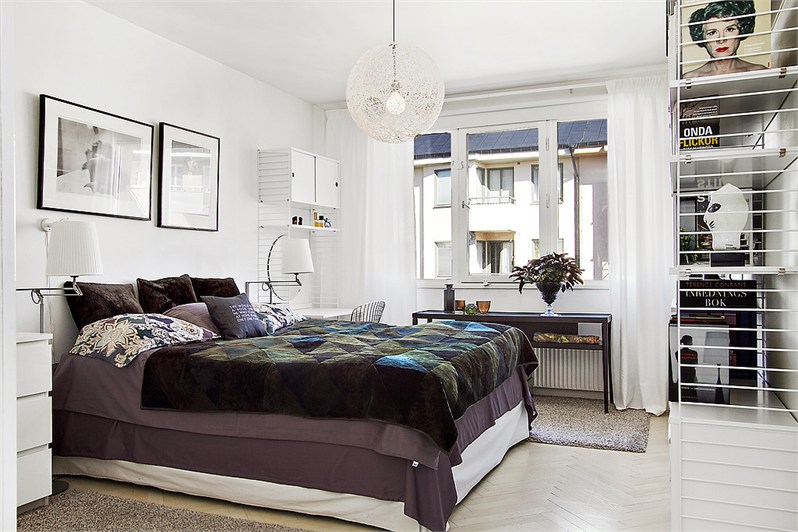 Una vez más, esta vez en el dormitorio principal, encontramos mezcla de piezas, dos lámparas de pie, un par de mesillas Malm y una consola todo de Ikea, junto a la lámpara de techo Random de Moooi.
