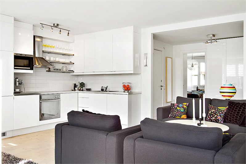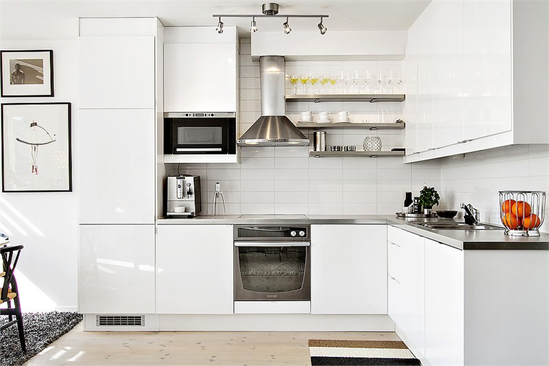 Al encontrarse abierta al salón, es muy importante elegir un mobiliario que se integre en el espacio, para lo que se ha escogido una cocina en color blanco sin tiradores y con armarios hasta el techo.