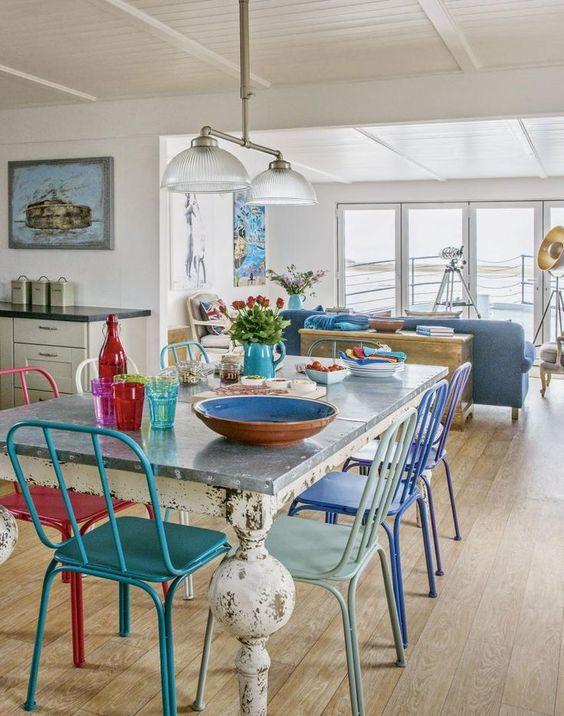 Claramente, la pintura envejecida de la mesa y la terminación de su superficie en chapa unen perfectamente ambos elementos y le dan un estilo único al espacio.