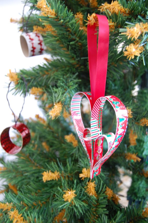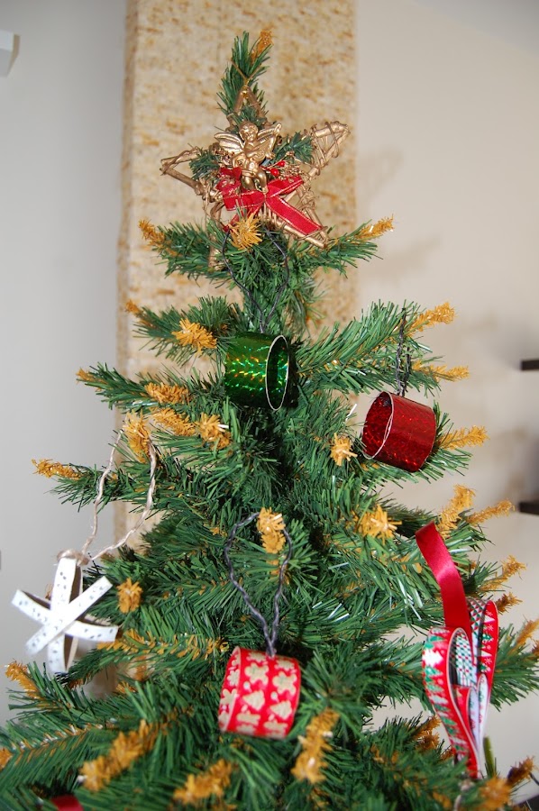 Aparte de las formas de corazones, hay copos de nieve con lentejuelas que dan brillo, cilindros forrados de washi tape que parecen bolas, bolas de lana... Para mí la Navidad es de color rojo, así que ese ha sido mi color principal para adornar el árbol, con toques de blanco, y el dorado reservado para la estrella. ¿Qué te parece?