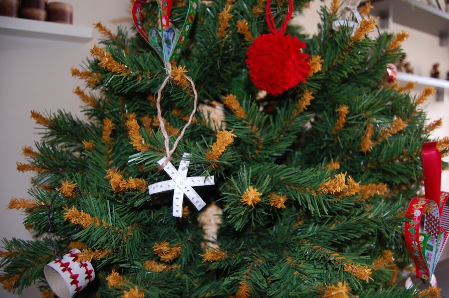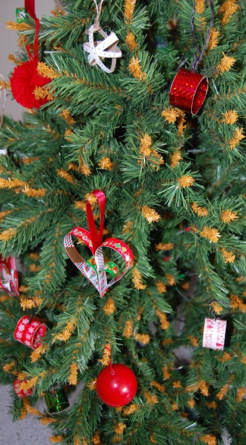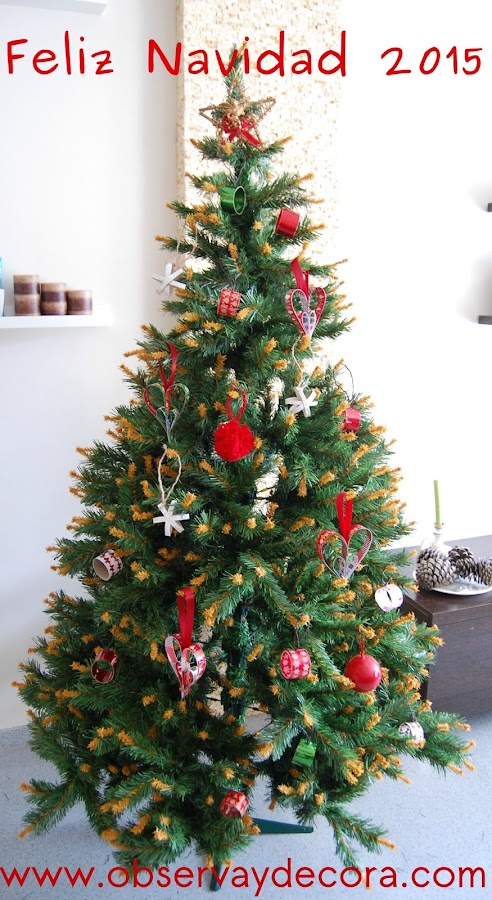 Este año es 100% adornos reciclados hechos con cartón, cartulinas, rollo de papel higiénico, lana, washi tapes, lazo, cuerda... y poco más. Hice un vídeo de cómo hacer uno de los adornos en forma de corazón (en la página de Facebook podéis buscarlo)