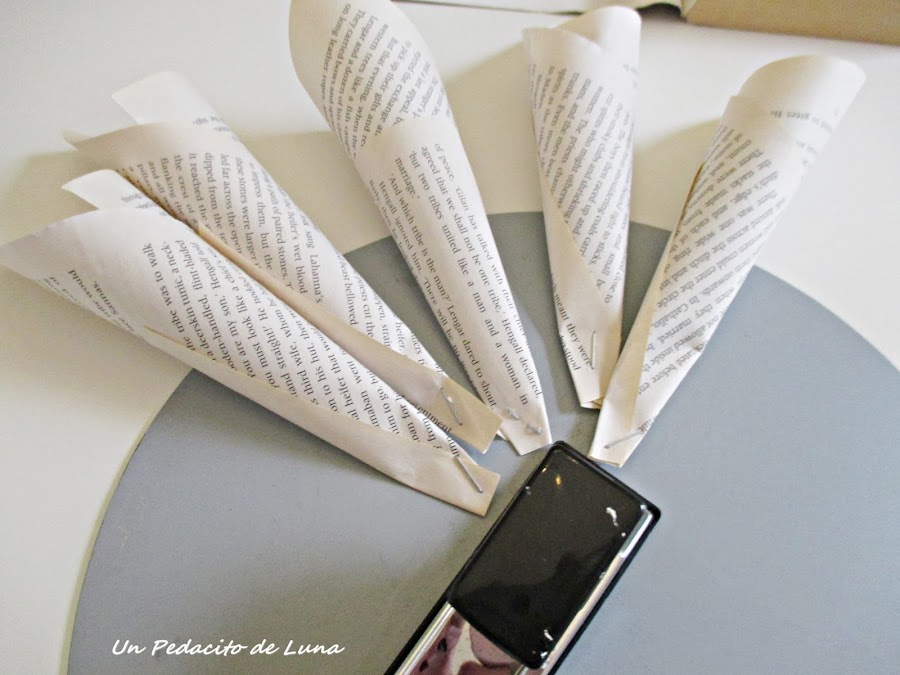 Se trata de hacer conos con las páginas del libro para irlos disponiendo de manera circular sobre un cartón o cualquier otro soporte que tengamos, yo utilicé la trasera de un espejo que me había sobrado de otro trabajo.