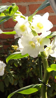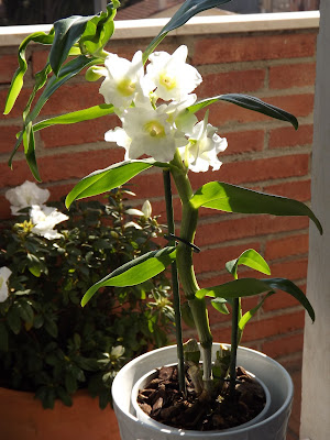 Por fin mi orquídea llamada "Cattleya Gaskelliana", que vaya nombre, ha empezado a florecer...Le ha costado, hasta empecé a dudar de si echaría flores, pero aquí está preciosa, con multitud de brotes que poco a poco empiezan abrirse...Todas sabéis mi debilidad por esta preciosa planta, tengo por lo menos cinco en casa pero casi todas de la variedad phalaenopsis, la más común, pero el año pasado Victor me regaló ésta y desde el primer día la encontré preciosa y diferente y hasta hoy he estado esperando su floración que me ha sorprendido porque nunca pensé que en pleno invierno y con este frío pudiera echar tantas florecillas...Orgullosa que estoy, sé que hay amigas que no consiguen nunca que broten y se desesperan y hasta incluso las acaban dejando hasta que finalmente mueren...Paciencia, chicas, con las plantas y sobre todo con las orquídeas, paciencia y si somos persistentes y positivas conseguiremos tenerlas mucho más que preciosas...