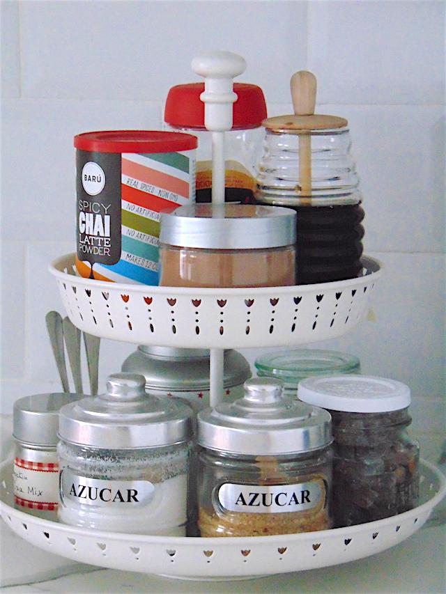 El stand de dos alturas es también de IKEA y tiene todo lo necesario para aderezar nuestro café o la leche de las peques.